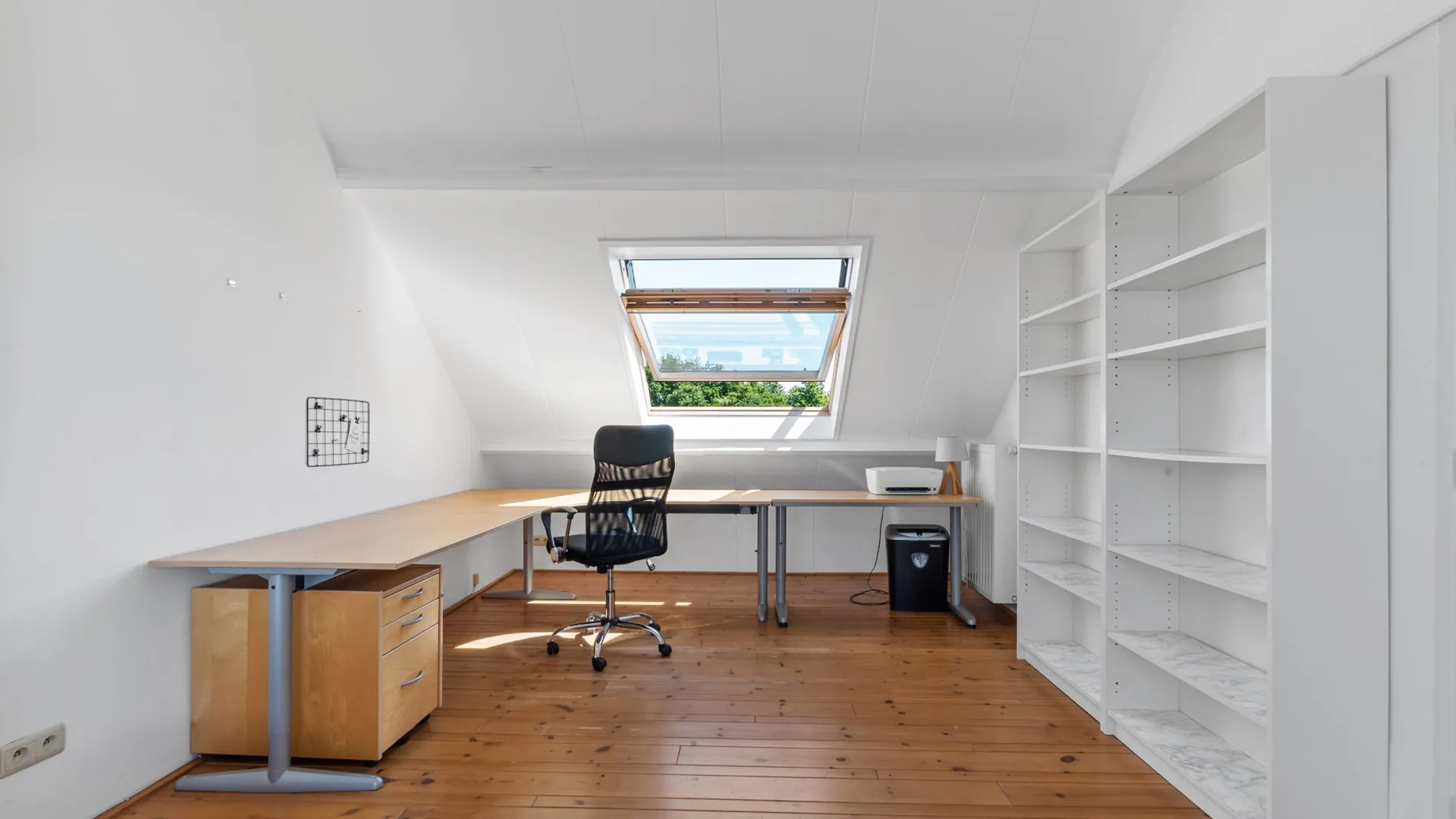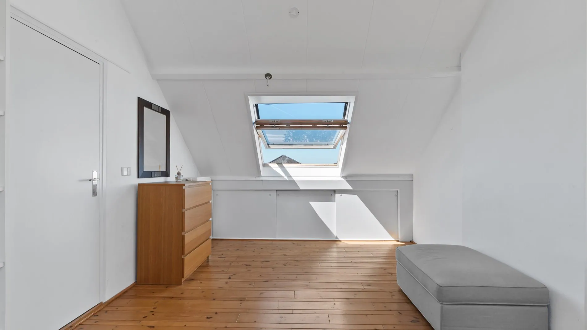 De zolderverdieping is bereikbaar via een vaste trap en beschikt over een bijzonder ruime (slaap)kamer met ingebouwde kasten en een extra kamer die perfect dienst kan doen als kinderkamer of opbergruimte.