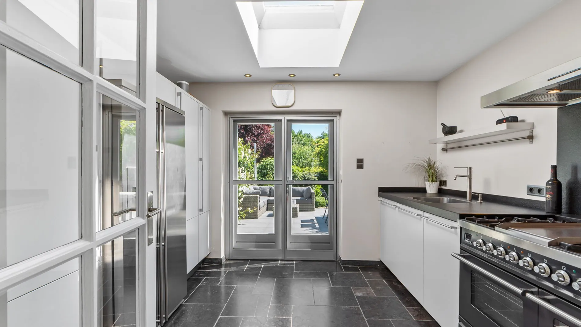 Bij het betreden van de woning kom je binnen in een stijlvolle inkomhal met donkerblauwe natuursteen. Van hieruit bereik je de royale L-vormige leefruimte die is voorzien van een warme eikenhouten parketvloer en gezellige houtkachel. De dubbele glazen deur geeft toegang tot de moderne keuken. De keuken, tevens voorzien van een natuurstenen vloer, is uitgerust met een Amerikaanse koelkast en een hoogwaardig gasfornuis van Boretti. Tenslotte is er een praktische berging/wasruimte en afzonderlijk gastentoilet.