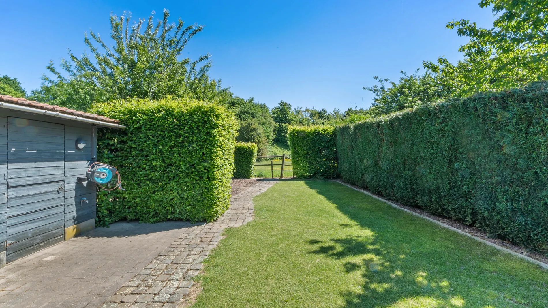 De buitenruimte is eveneens tot in de puntjes verzorgd. Het volledig aangelegde terras biedt een heerlijke plek om te ontspannen, terwijl de tuin professioneel ontworpen is door een tuinarchitect. Dankzij een doordacht beplantingsplan staat er altijd iets in bloei. Daarnaast grenst de achtertuin aan paardenweide en zijn er tal van wandelpaden rond het Albert Kanaal in de omgeving. Verder is er een afzonderlijke tuinberging.