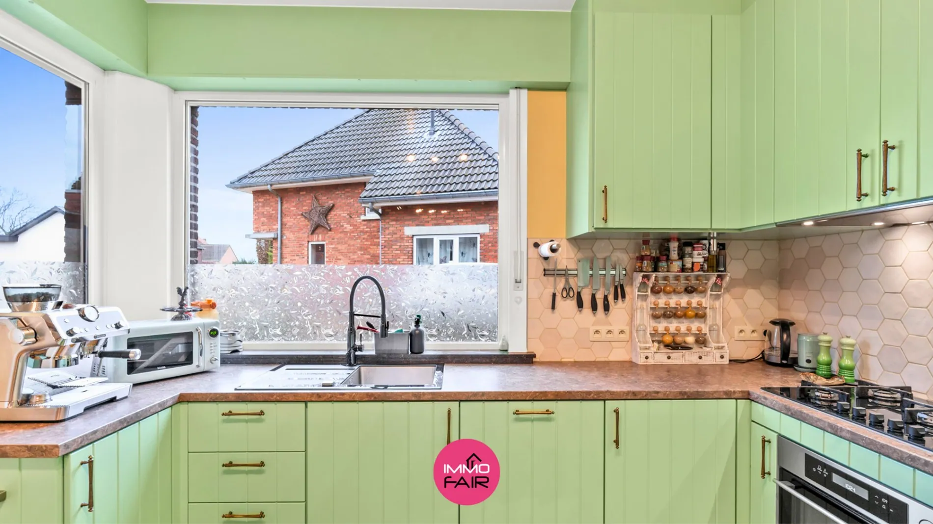 Via de inkomhal heb je toegang tot de leefruimte met open keuken. De gezellige zithoek bevindt zich vooraan in de woning en is uitgerust met airconditioning. De open keuken is voorzien van alle comfort en is ingericht met inbouwapparatuur.