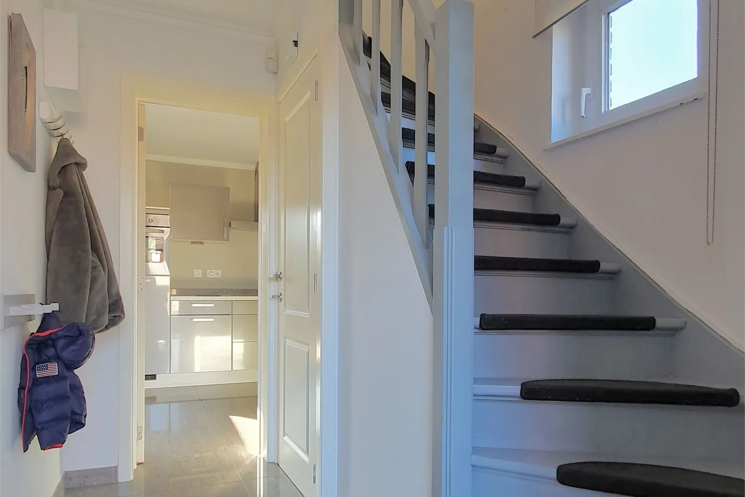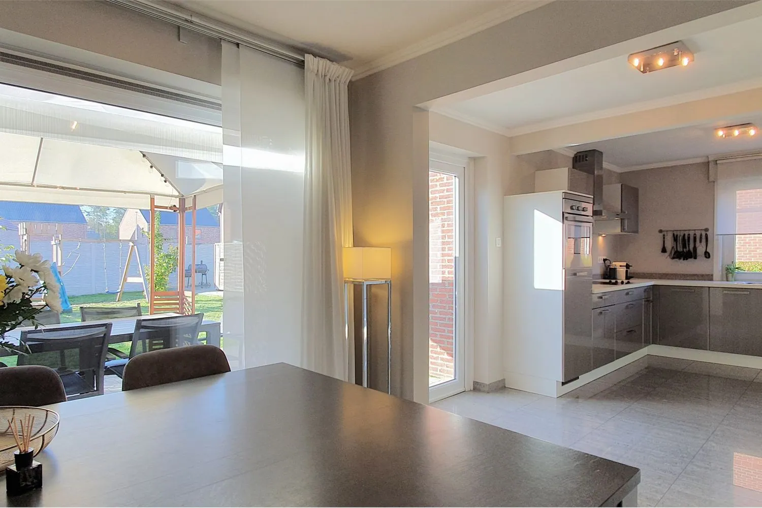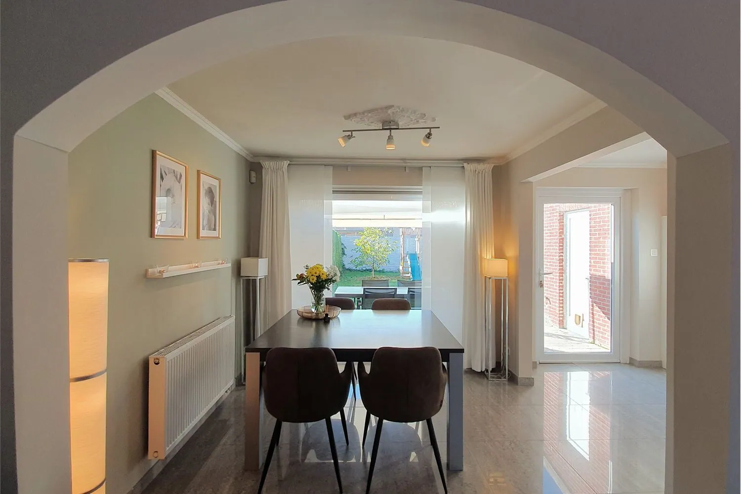 De inkomhal met gastentoilet leidt naar de leefruimtes. Deze zijn ingedeeld in een woonkamer met zithoek, een eetkamer en een keukengedeelte. De grote ramen in dit interieur zorgen voor een aangename lichtinval en geven een fijne verbinding met het terras en de achtertuin.