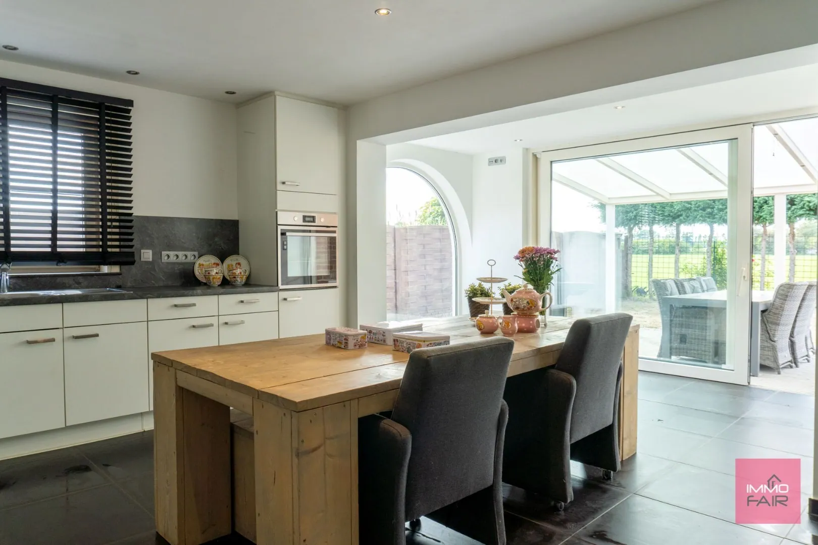 Via de inkomhal met gastentoilet heb je toegang tot de leefruimte. De royale leefruimte bestaat uit een gezellige zit-, eet- en leeshoek. Deze mooie ruimte leidt rechtstreeks naar de lichtrijke keuken. De moderne keuken is voorzien van alle comfort. Via de grote schuiframen heb je toegang tot de achtertuin met overdekt terras. Van hieruit kan je genieten van een panoramisch uitzicht op de velden.