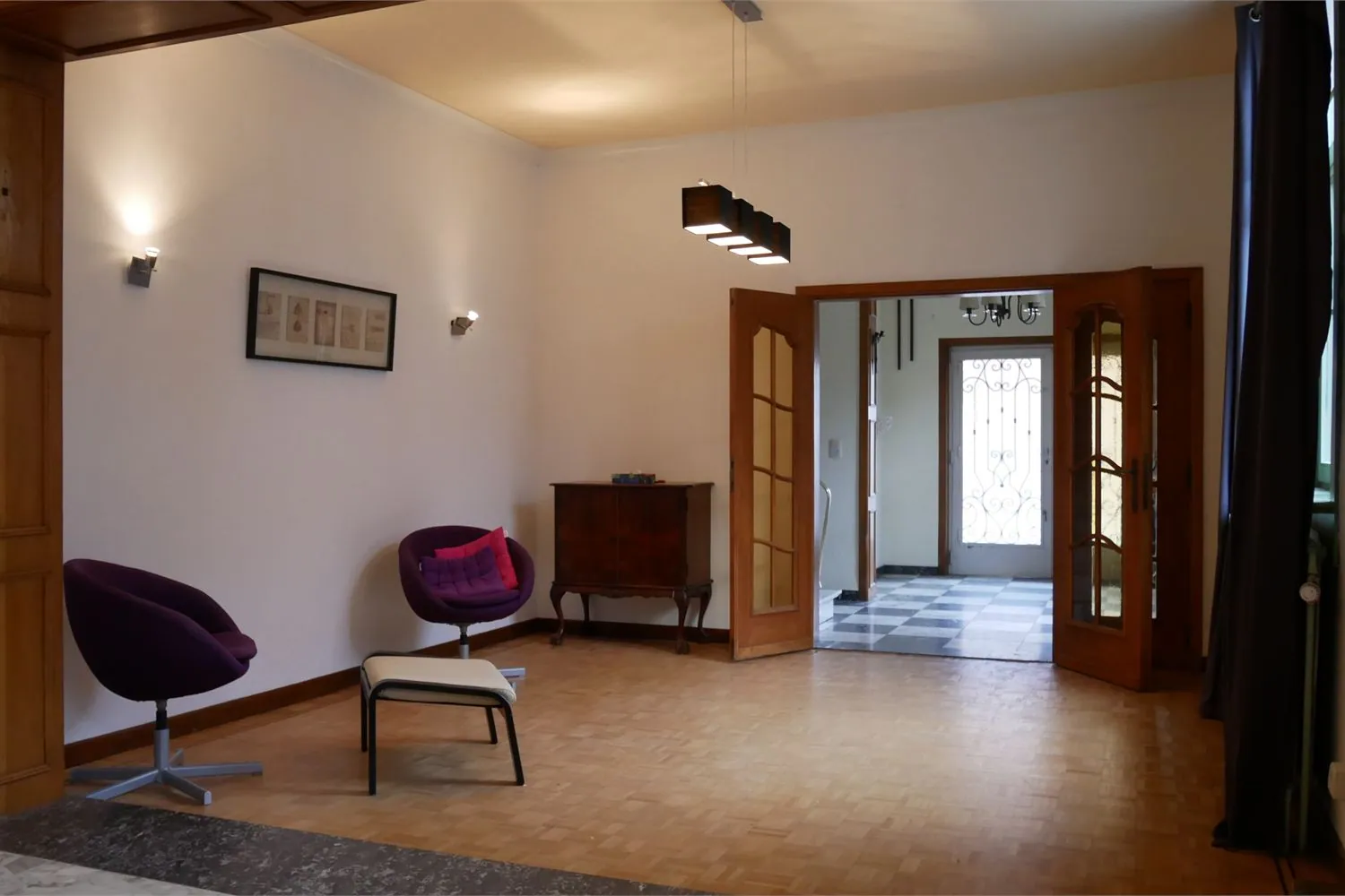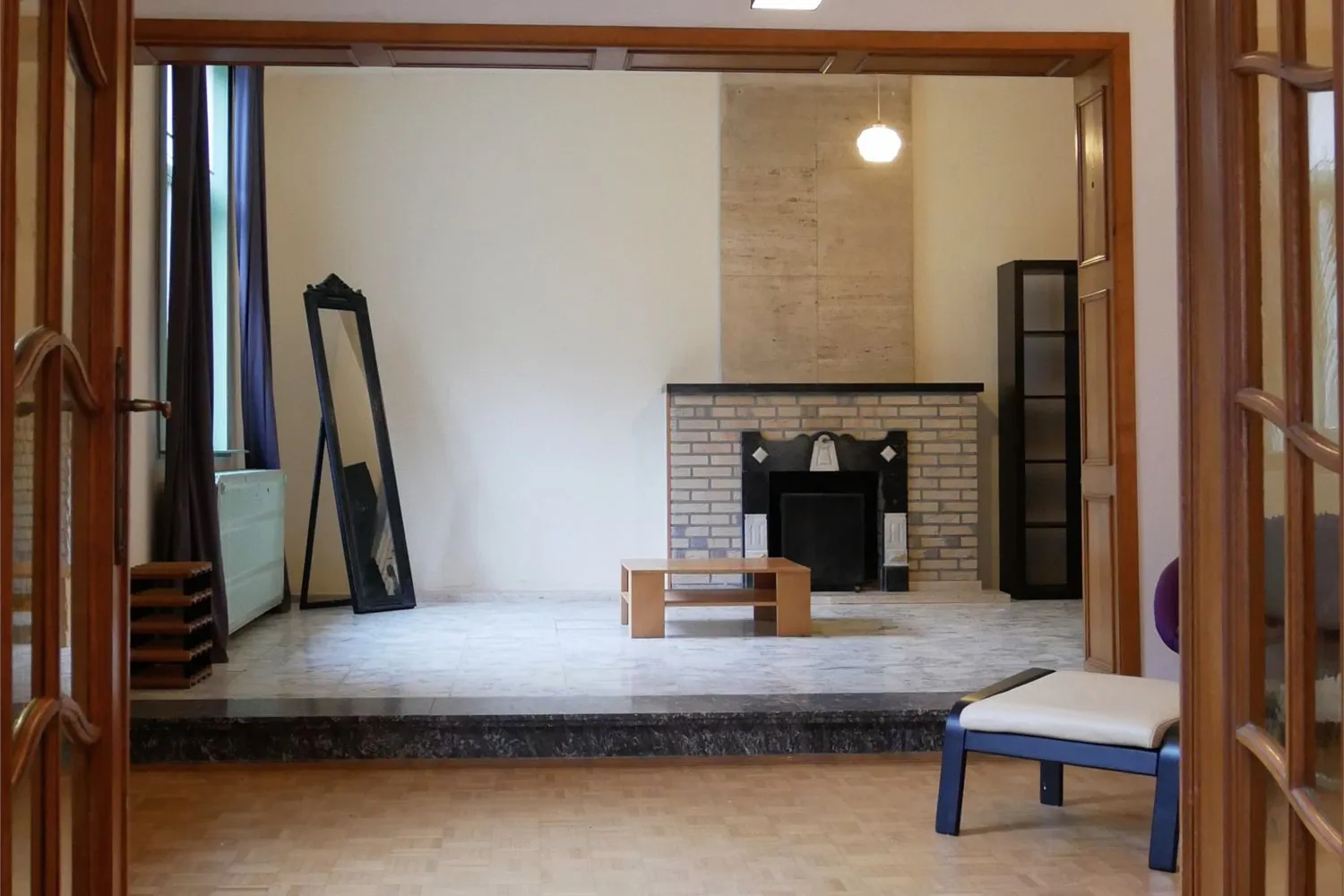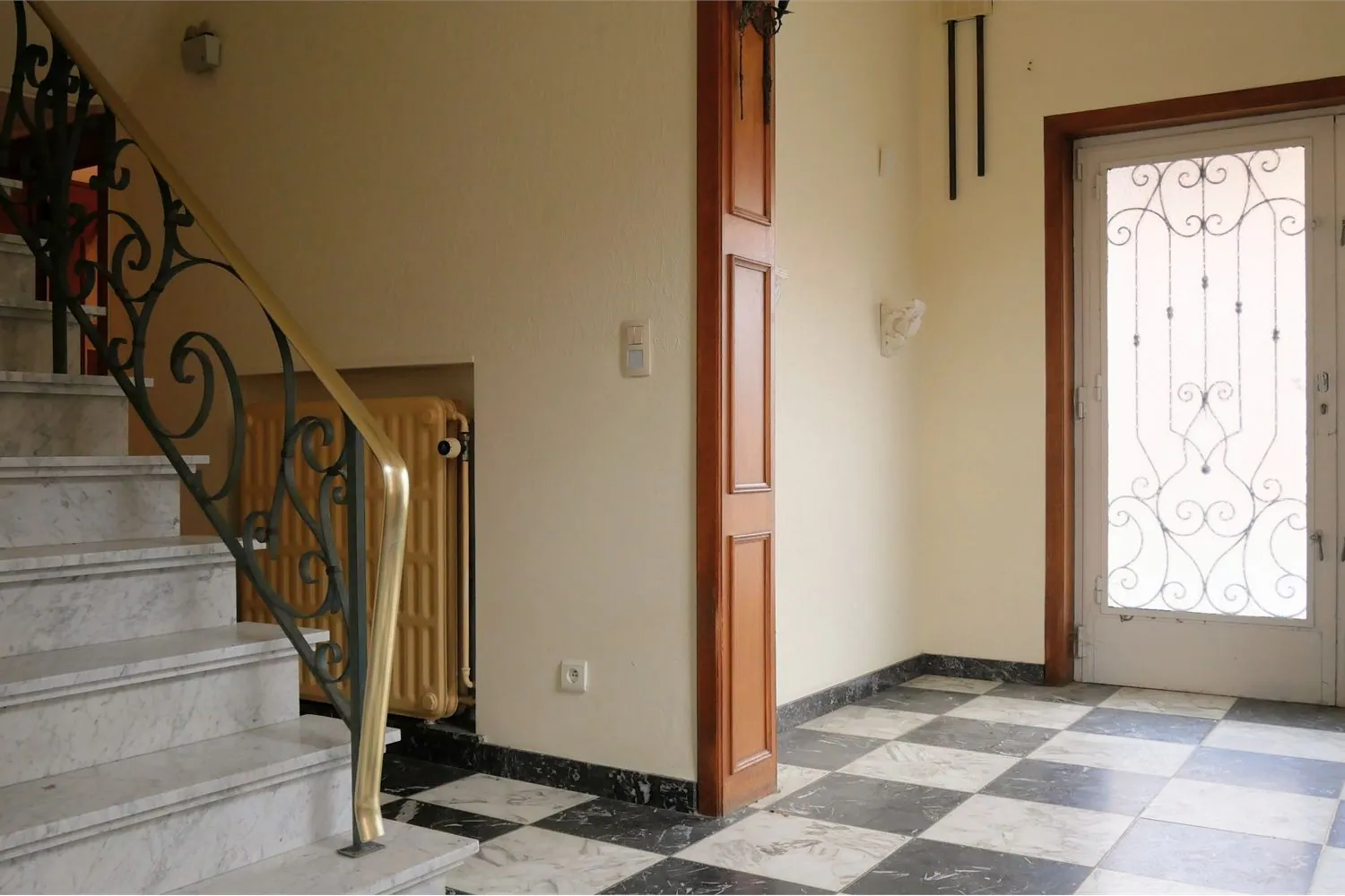 Benedenverdieping: de royale inkomhal heeft een sierlijke trap in witte marmer met smeedijzeren balustrade. Een dubbeldeur leidt naar de woonvertrekken met parketvloer in dambordmotief. Centraal is er een open haard met rondom de stijlschouw. De hoge ramen zorgen hier voor een mooie lichtinval vanuit de binnenkoer.