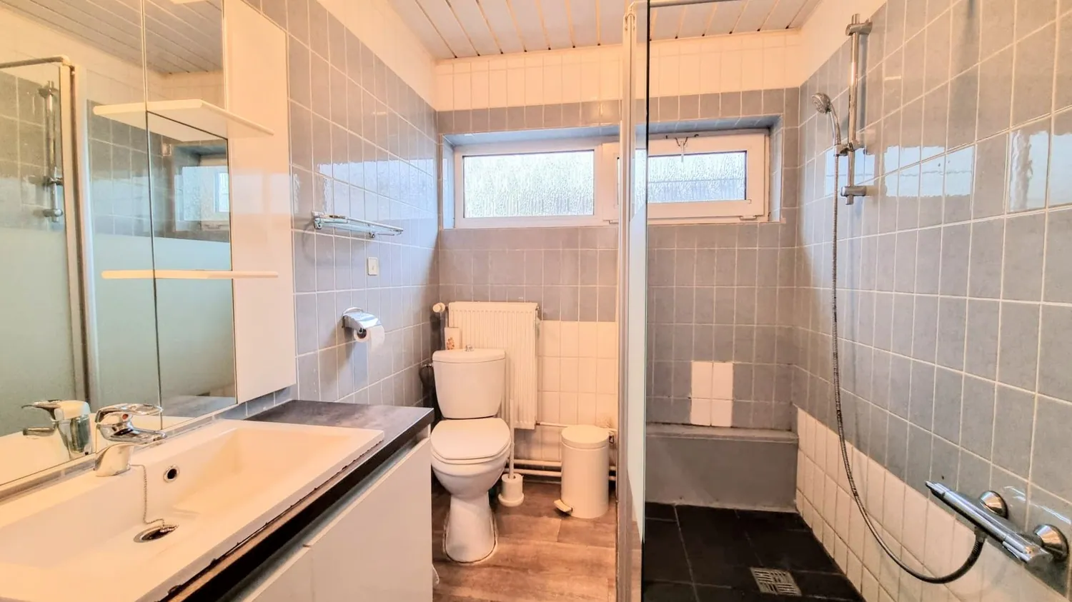 Via de inkomhal met gastentoilet bereik je de leefruimte bestaande uit een lichtrijke zit- en eethoek. Aansluitend is er een open keuken met inbouwapparatuur (keramische kookplaat, oven) en een koelkast en vaatwasser.
