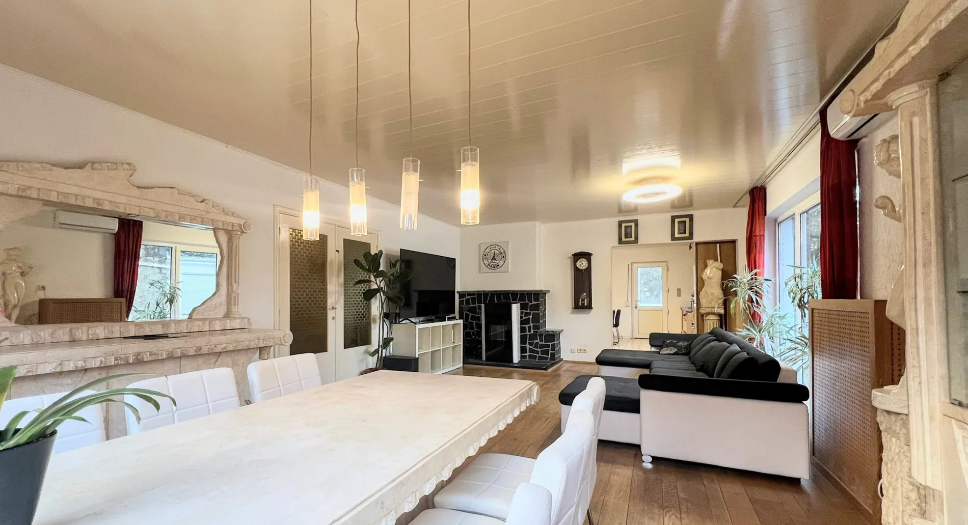 De inkomhal geeft uit op de woonvertrekken. Via de kamerbrede raampartijen heb je een mooie lichtinval. De leefruimte van ca. 37m² is ingericht als eetkamer en knusse zithoek. Naastgelegen bevindt zich een volledig ingerichte leefkeuken met ontbijthoek aansluitend kun je via het overdekte terras de achtertuin bereiken.