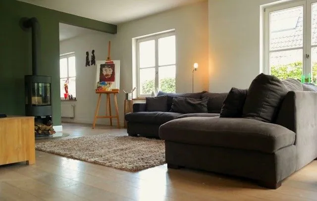 De leefruimte is opgedeeld in een zithoek met een gezellige houtkachel, een semi-open bureelruimte en een eetkamer. Hier zorgen grote ramen met kruishouten en een lichte parketvloer voor een klassieke uitstraling.