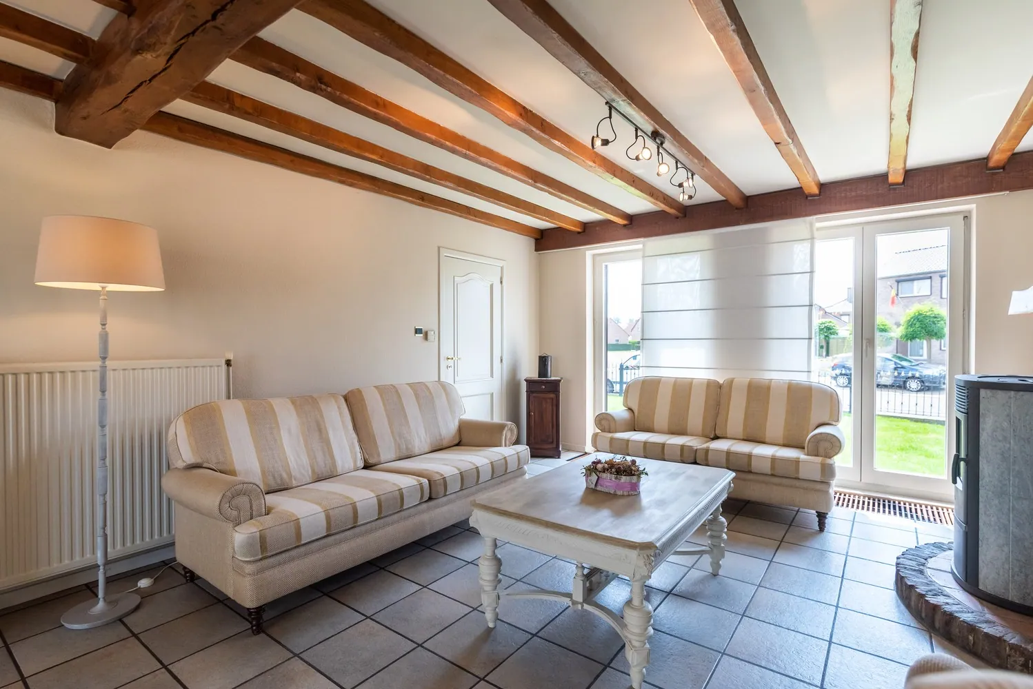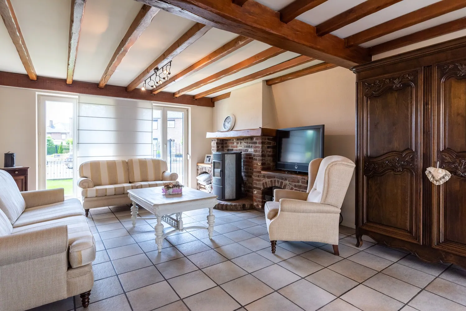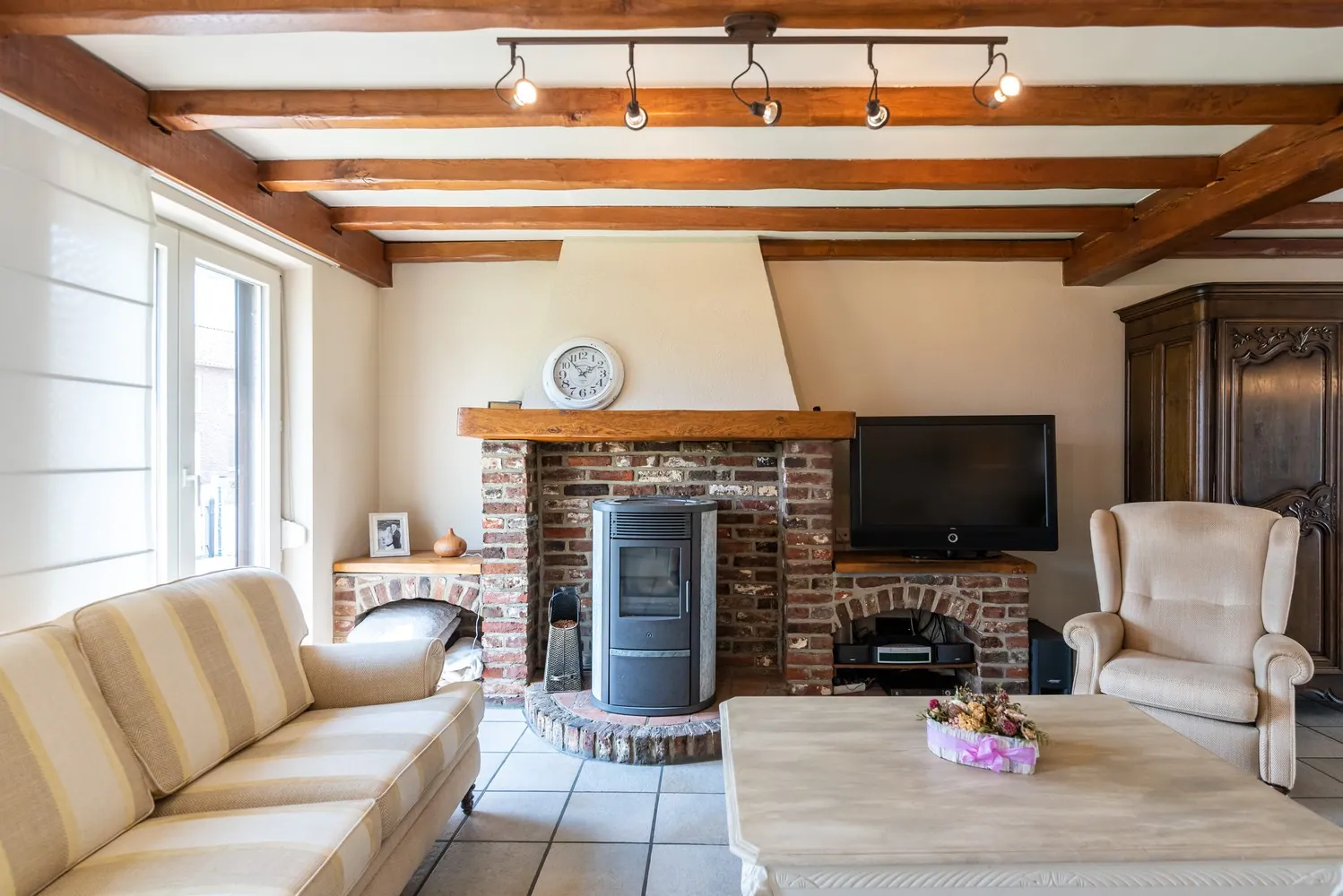 In de leefruimte zorgt de pelletkachel voor warmte en gezelligheid. Via de grote raampartijen geniet je van extra veel daglicht. De ruime leefkeuken is uitgerust met degelijke keukenapparatuur (combi-oven, vaatwasser, koelkast en fornuis) en een composiet werkblad. In de keuken is er ook een aangename zithoek.