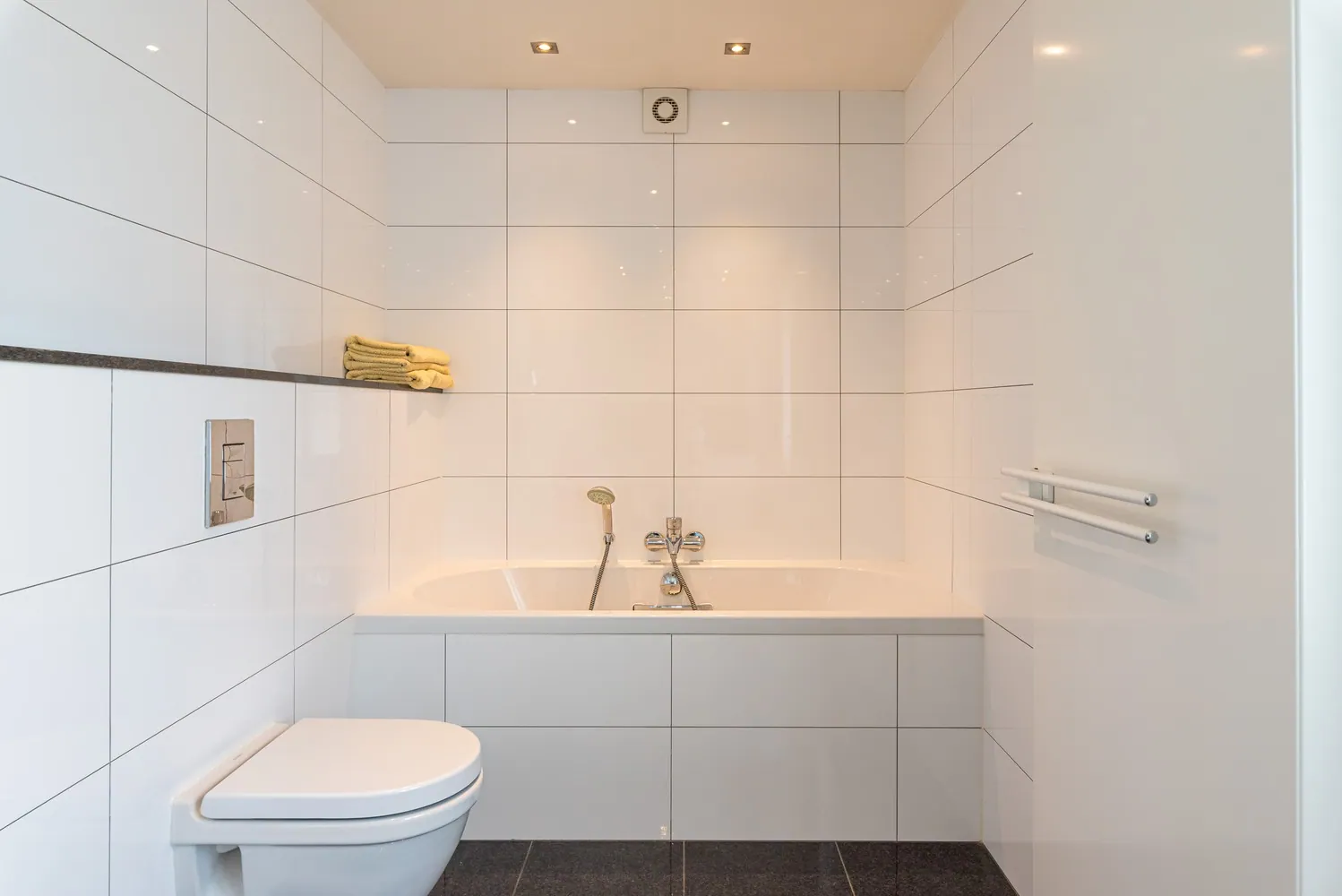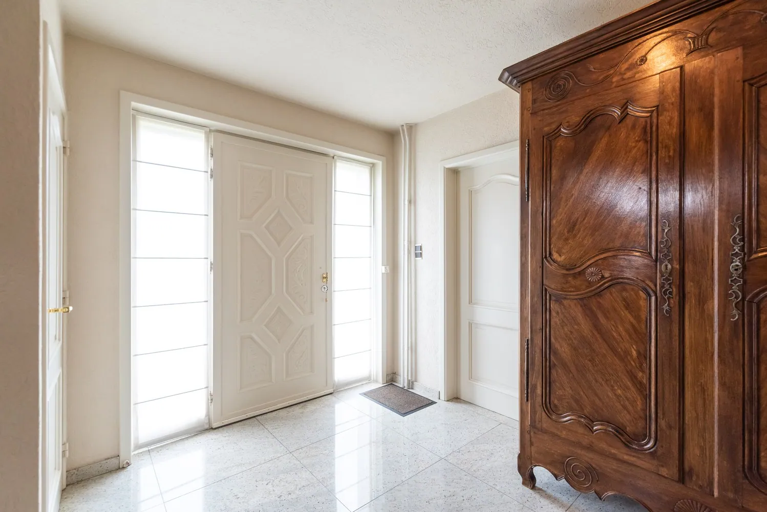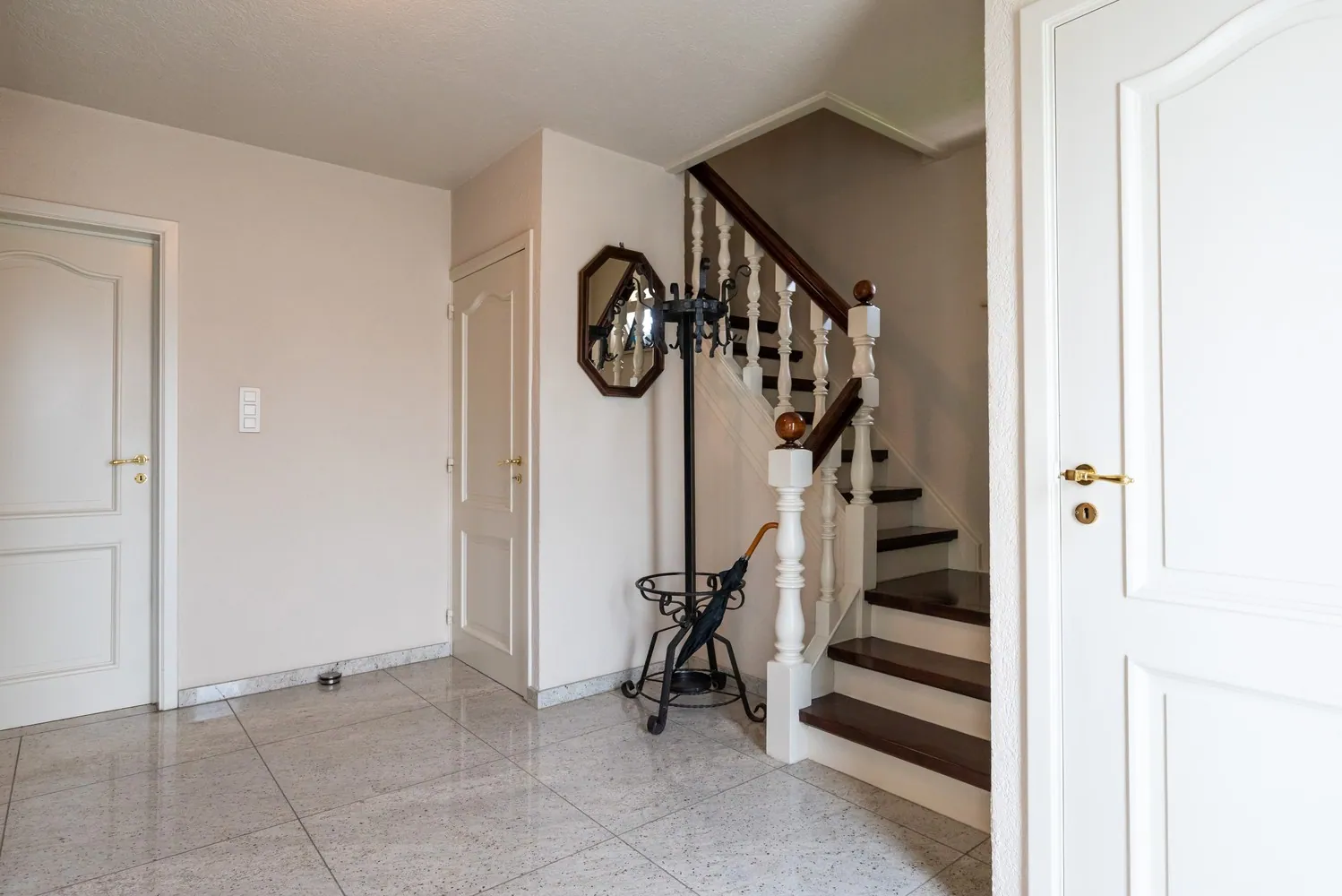 De inkomhal geeft uit op het gastentoilet, de keuken en de leefruimte.