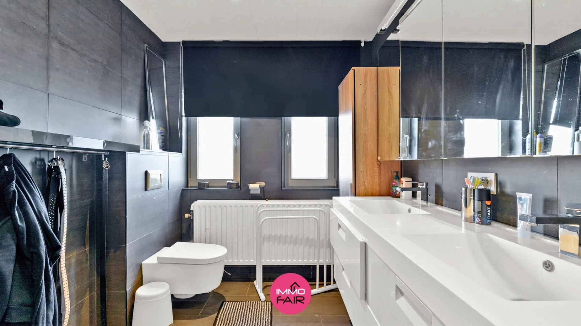 Aan de inkomhal bevindt zich de eerste badkamer, uitgerust met een douche, toilet en lavabomeubel. Deze is praktisch gelegen, waardoor je niet door de volledige woning hoeft te gaan.
