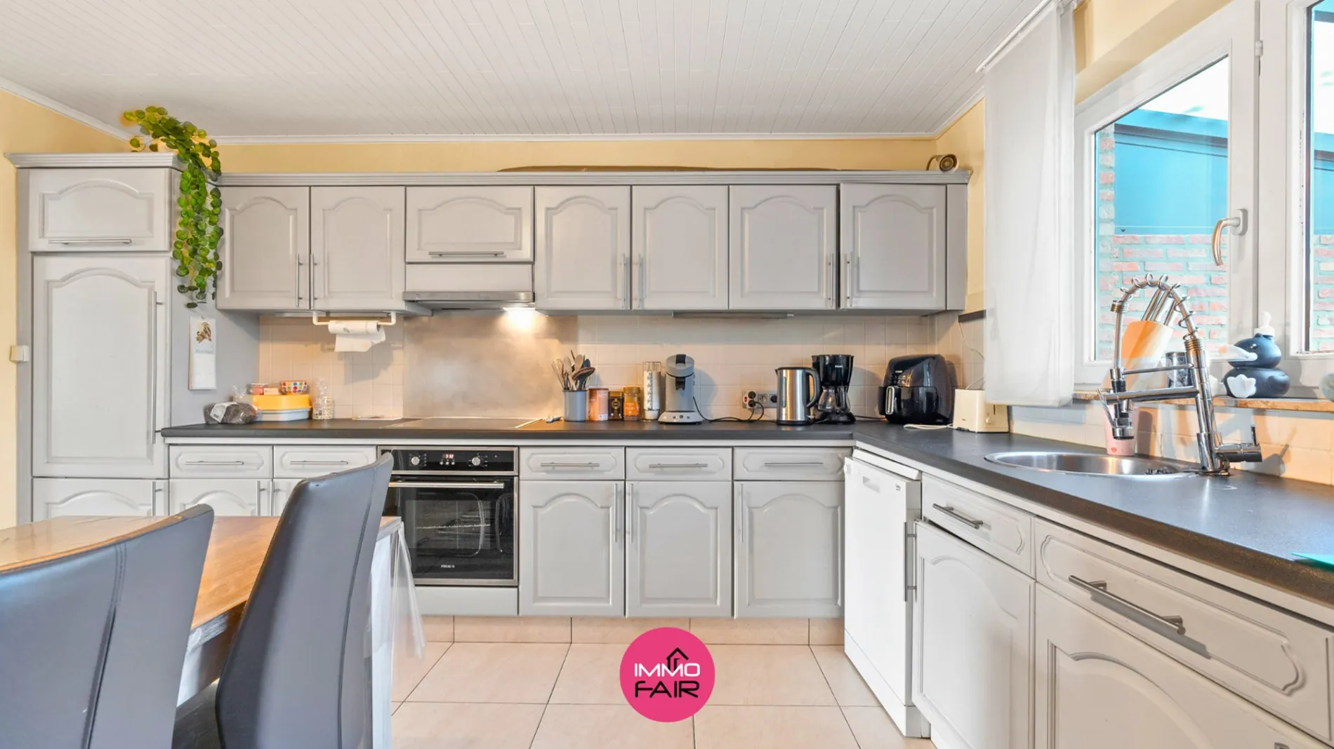 Aansluitend bevindt zich de leefkeuken van 15 m², uitgerust met inbouwapparatuur (vaatwasser, keramisch fornuis, oven en koelkast). Vanuit de keuken heb je een mooi zicht op het overdekte betegeld terras en de omheinde tuin. Tevens is er vanuit de keuken een rechtstreekse toegang naar de badkamer, ideaal voor gasten.