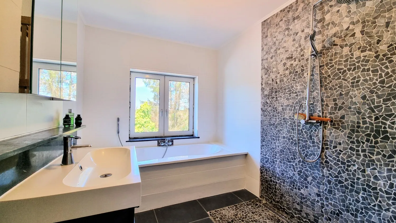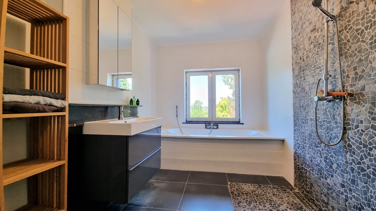 Via de nachthal bereik je drie slaapkamers en een ruime moderne, luxueuze badkamer. De badkamer is uitgerust met een royaal ligbad, regendouche, nachttoilet en lavabomeubel.