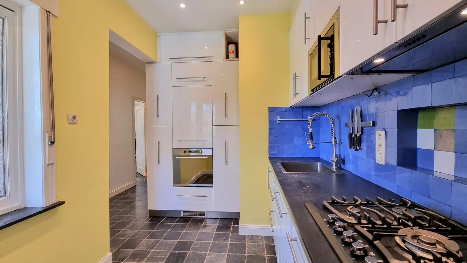 Via de inkomhal met een ruim gastentoilet bereik je de open leefruimte met zit- een eethoek. Verder is er een moderne keuken met inbouwapparatuur (5-pitsgasvuur, oven, magnetron, afwasmachine).