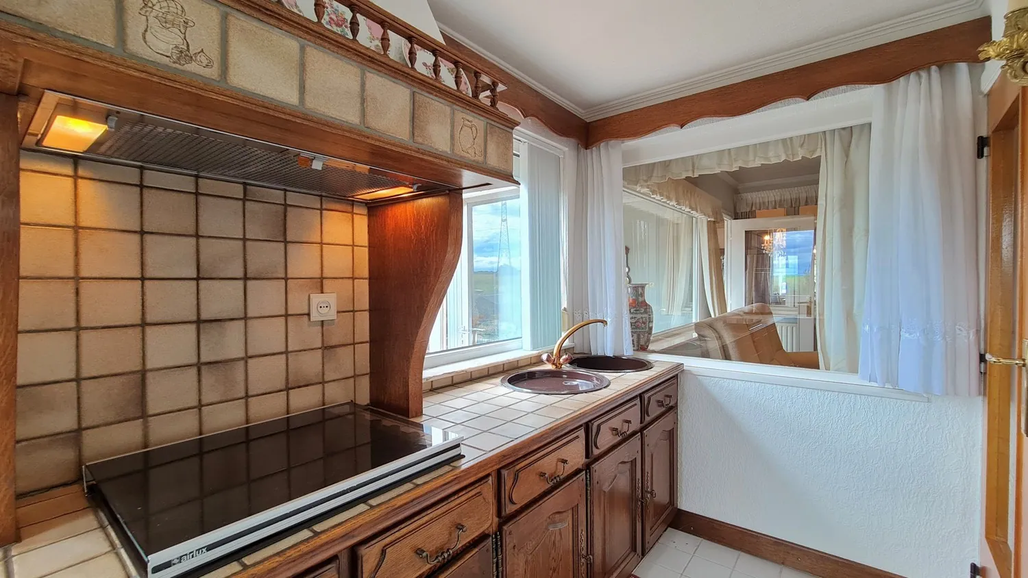De gezellige zitruimte geeft uit op een afzonderlijke keuken. Deze is uitgerust met een gasvuur, koelkast en spoelbak. Ook van hieruit heb je een open zicht op de tuin.