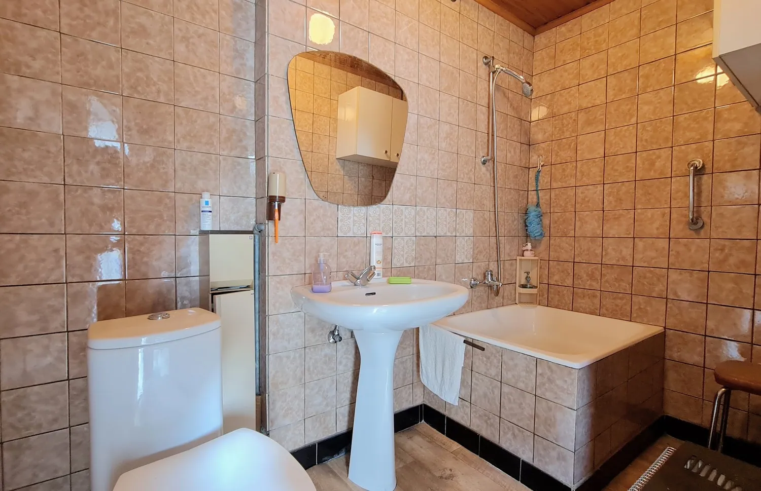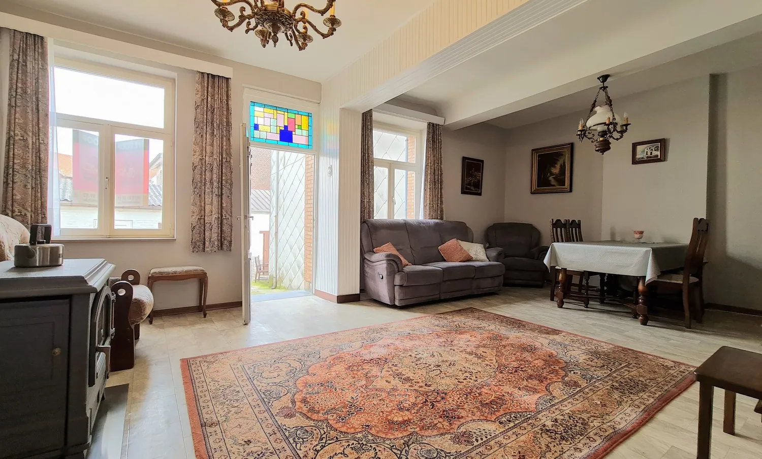 De ruime woonkamer van 30 m² beschikt over een zit- en eethoek en een authentieke houtkachel die zorgt voor een warme gezelligheid. Naastgelegen bevindt zich een eenvoudige keuken met bijkeuken.