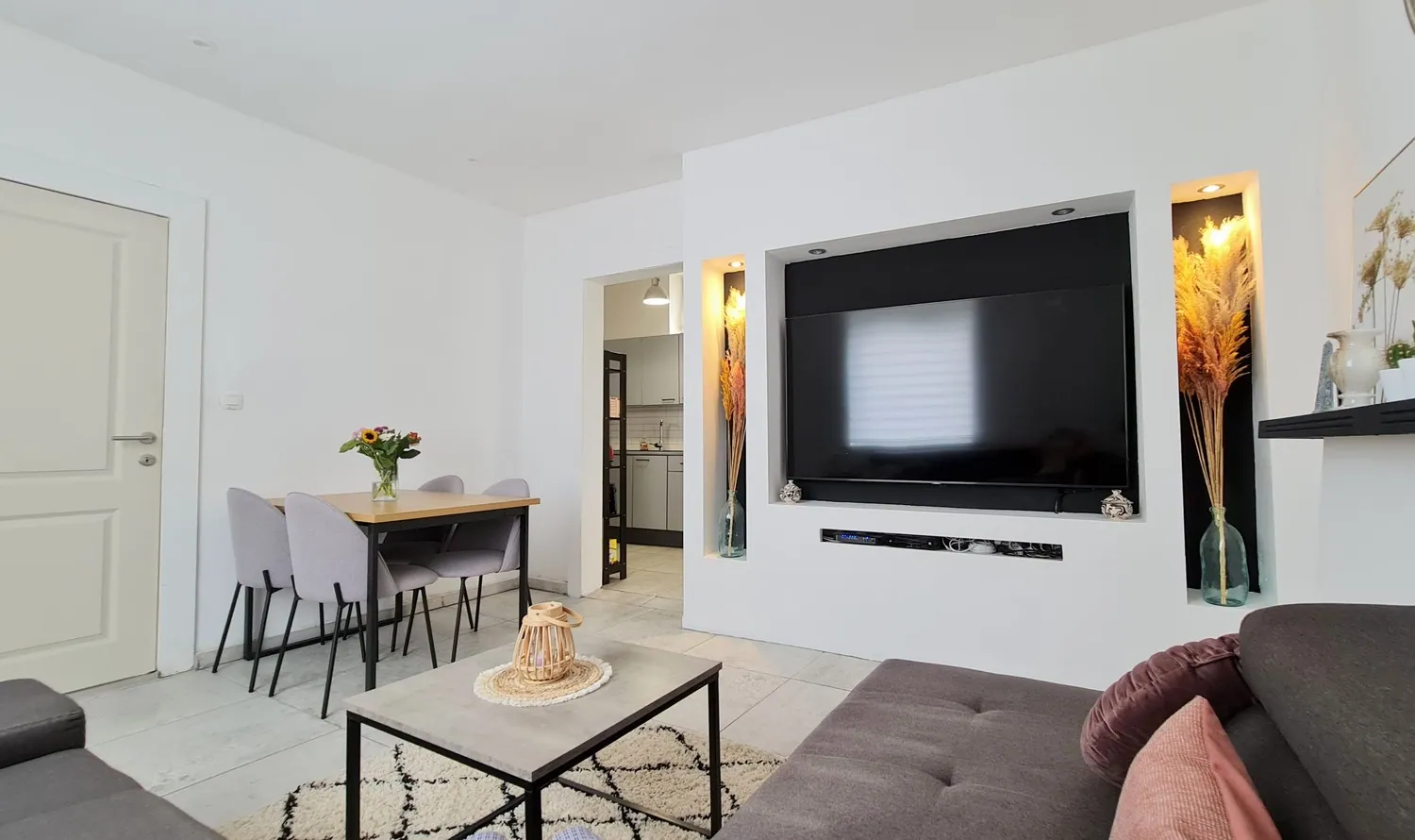 De inkomhal geeft uit op de gezellige leefruimte met zit- en eethoek met naastgelegen keuken. De keuken is uitgerust met inbouwapparatuur (oven, 5-pitsgasvuur, vaatwasser en spoelbak).