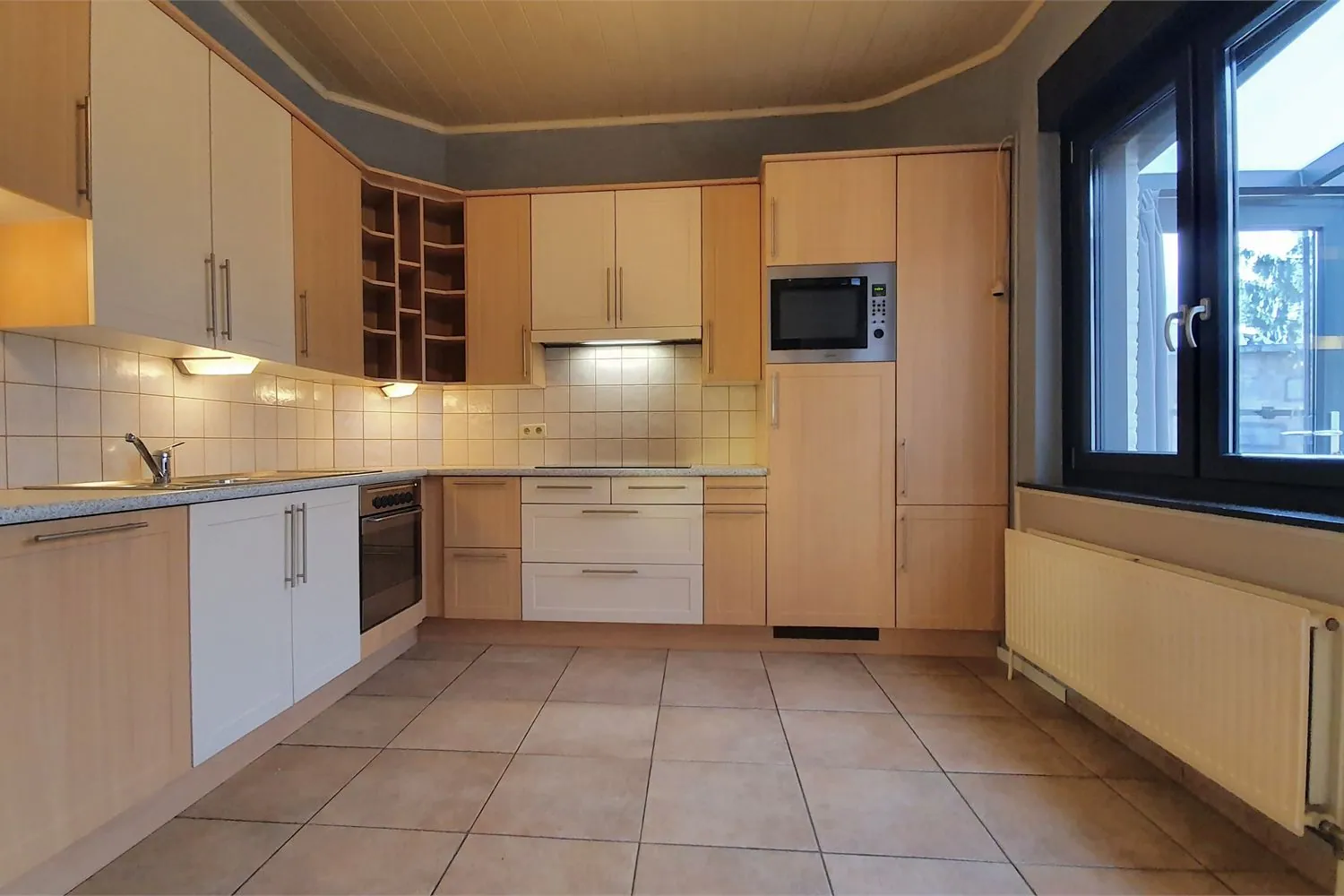 De entrée met trappenhal leidt naar de keuken en de woonkamer. De leefkeuken beschikt over alle inbouwapparatuur (koelkast, heteluchtoven, vaatwasser, dubbele spoelbak en een fornuis).