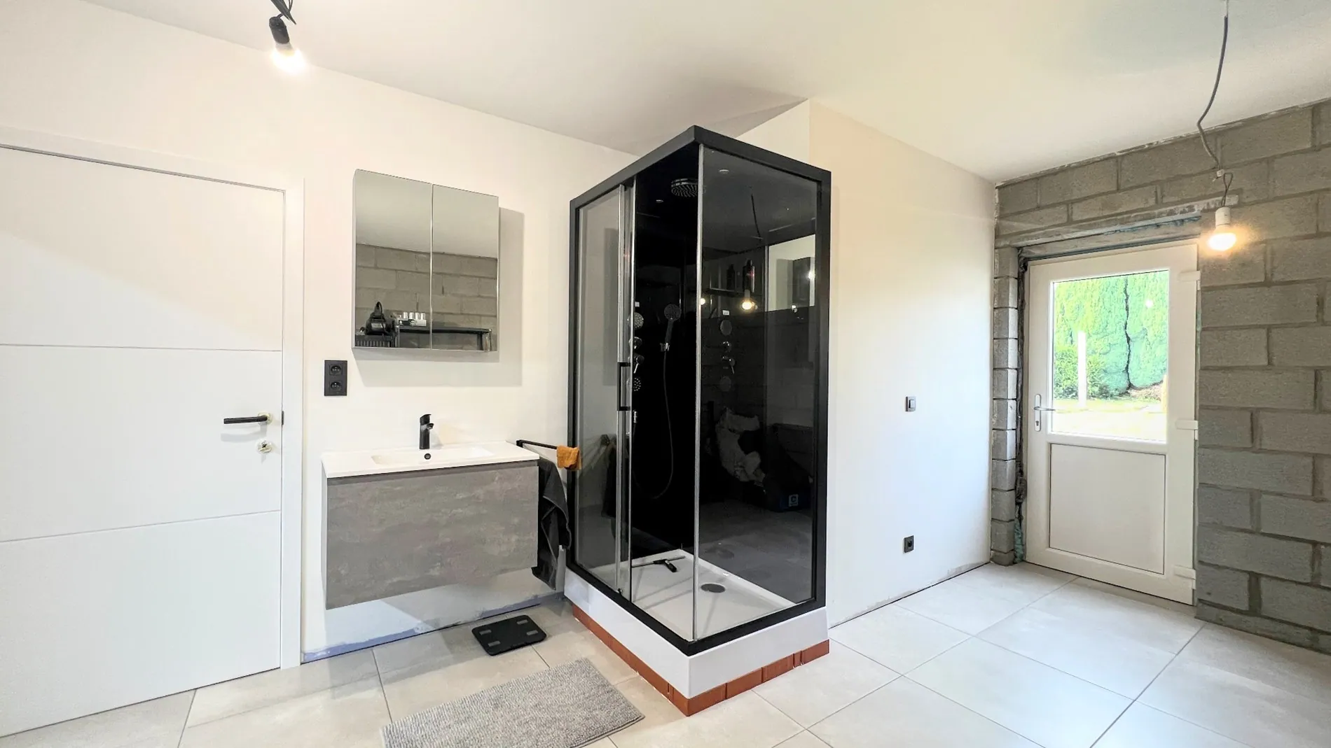 Via de inkomhal heb je toegang tot de leefruimte en open keuken met gastentoilet. Verder is er een praktische wasruimte met douche en lavabomeubel. Vooraan in de woning is er nog een berging. Vanuit de keuken heb je toegang tot de tuin.