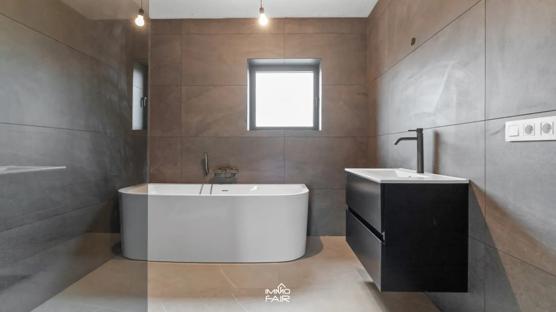 De badkamer is strak ingericht en voorzien van een inloopdouche, wastafel en ligbad.