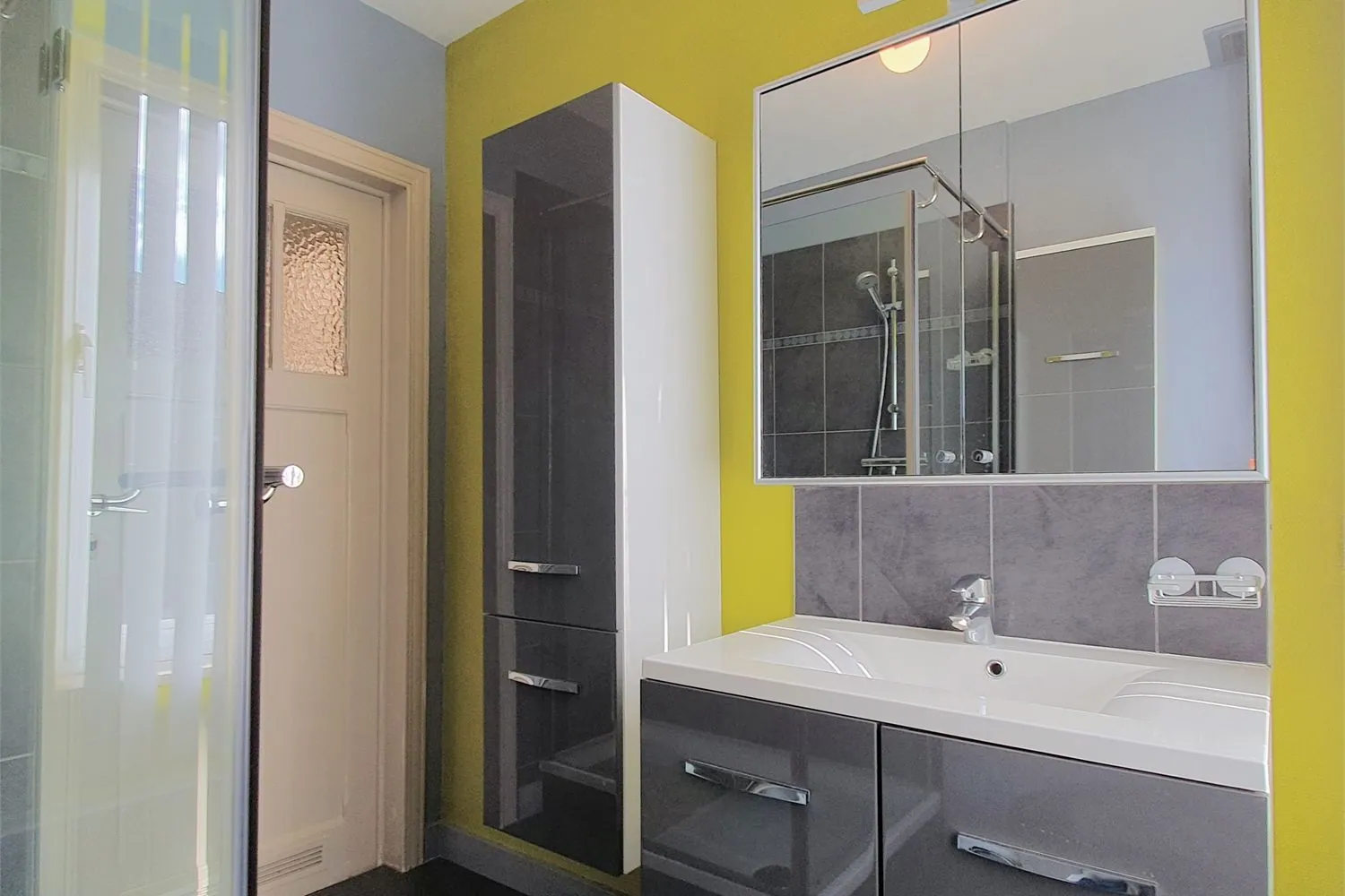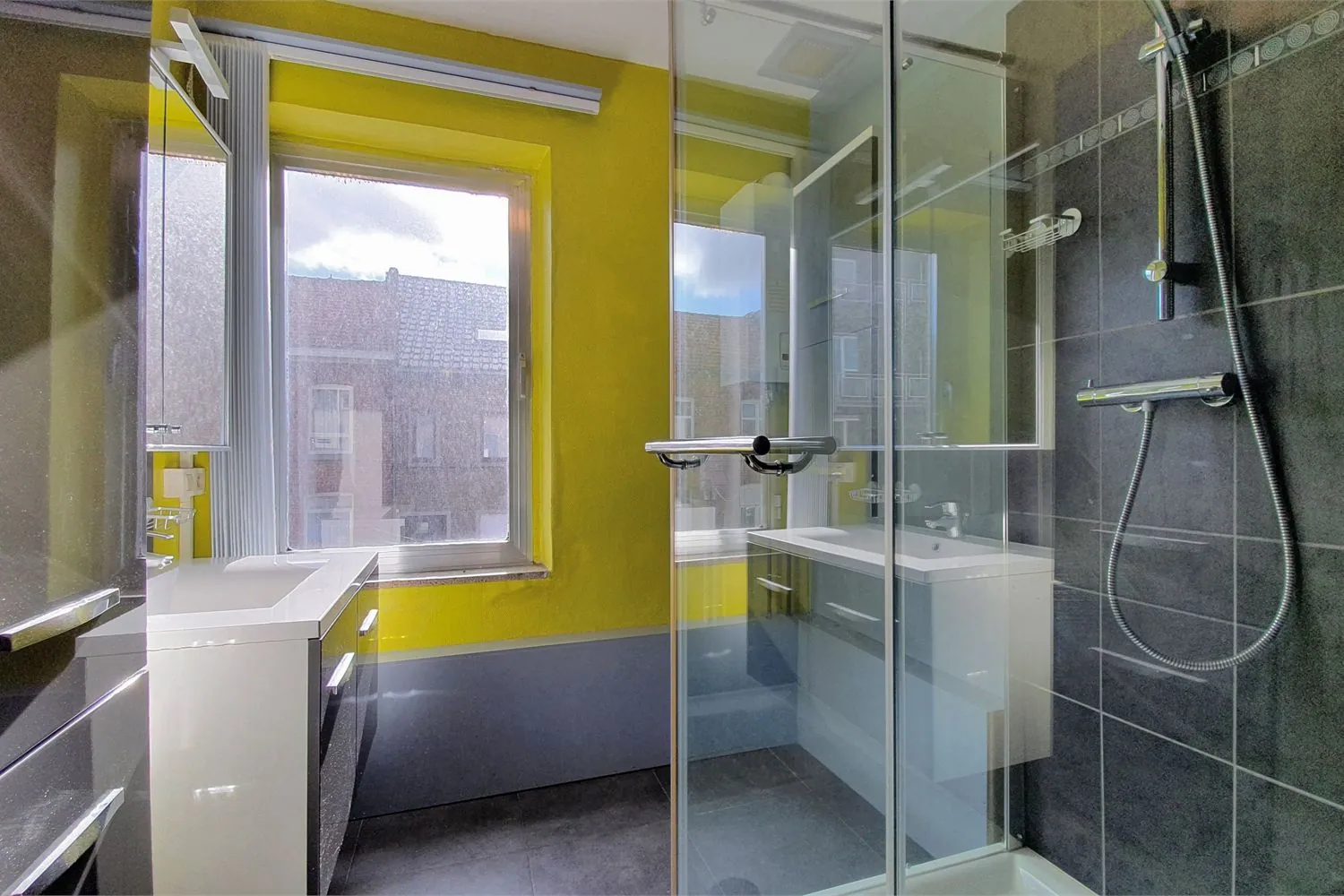 Op de 1ste verdieping geeft de nachthal uit op 3 slaapkamers ... en een modern ingerichte badkamer. De slaapkamers hebben een oppervlakte van 14 m², 13 m² en 6 m². De betegelde badkamer is voorzien van een inloopdouche en een lavabomeubel.