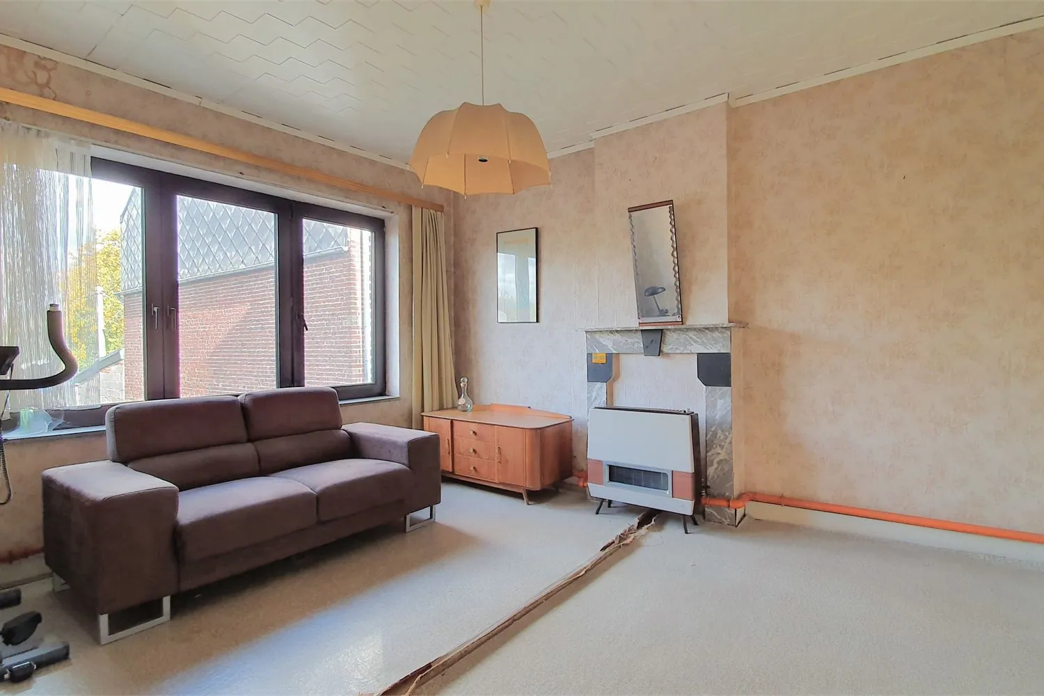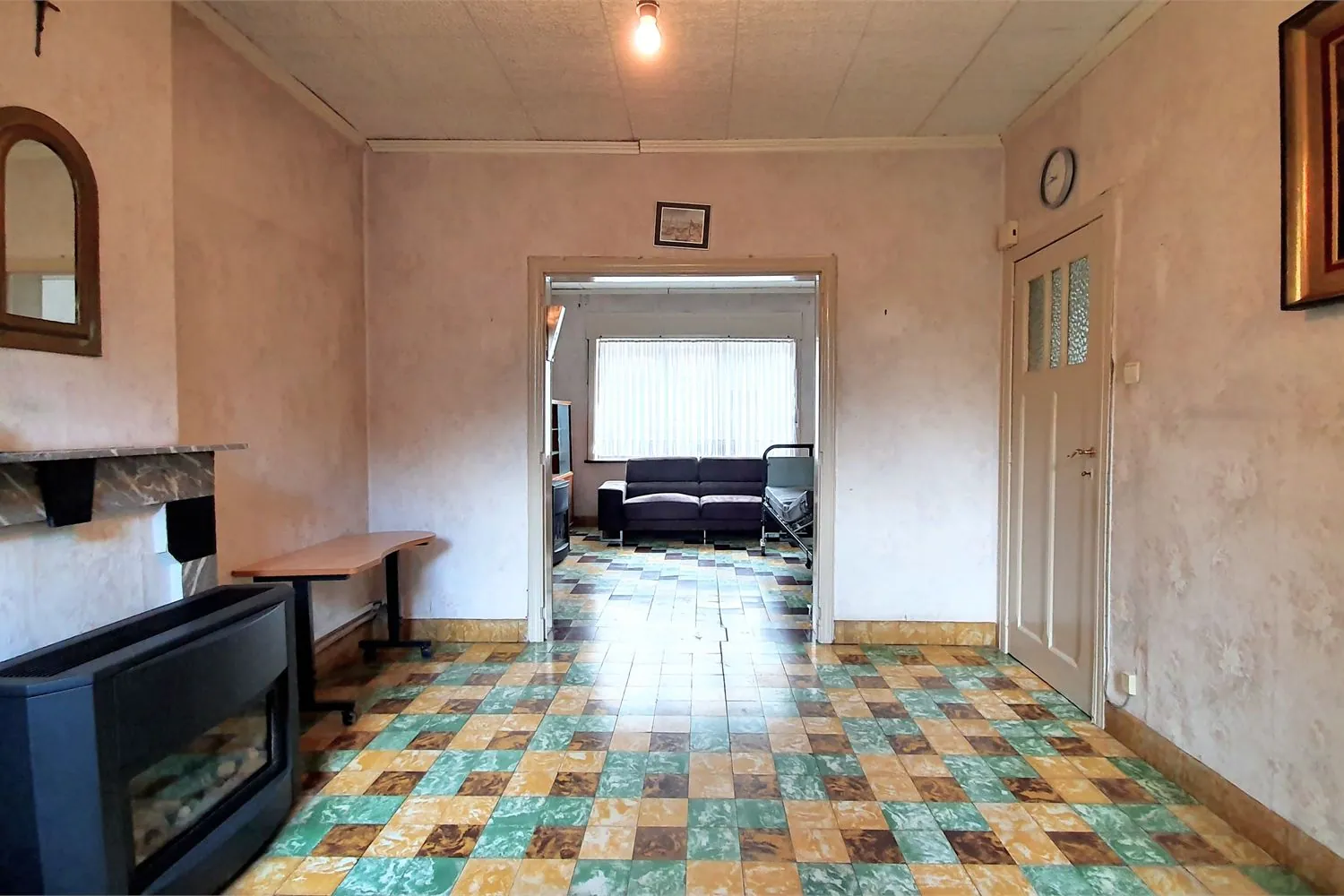 De inkomhal met afzonderlijk gastentoilet leidt naar de leefruimtes. De woonkamer van 28 m² is ingedeeld in een eetkamer en zithoek, voorzien van 2 schouwen met gaskachel. Vanuit de zithoek heb je zicht op de achtertuin.