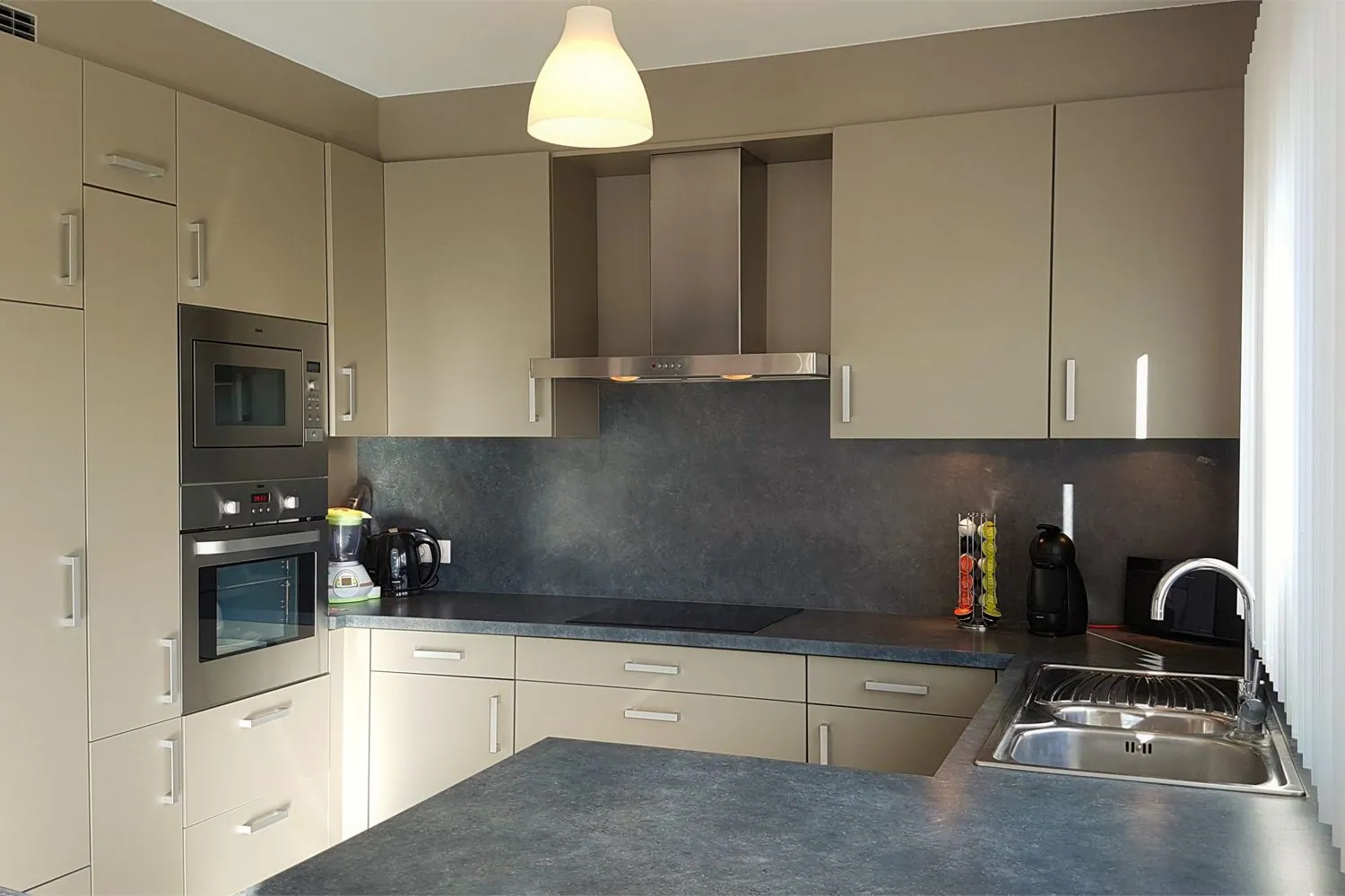 De inkomhal heeft een afzonderlijk gastentoilet. De leefruimte van meer dan 40 m² in L-vorm is ingedeeld in een gezellige zithoek en een semi-open ingerichte keuken. De keuken met ontbijthoek is geplaatst door de Keukengalerij te Bilzen. Deze is volledig ingericht met degelijke keukenapparatuur (vaatwasser, combi-oven, magnetron, inbouwkoelkast en inductiefornuis).