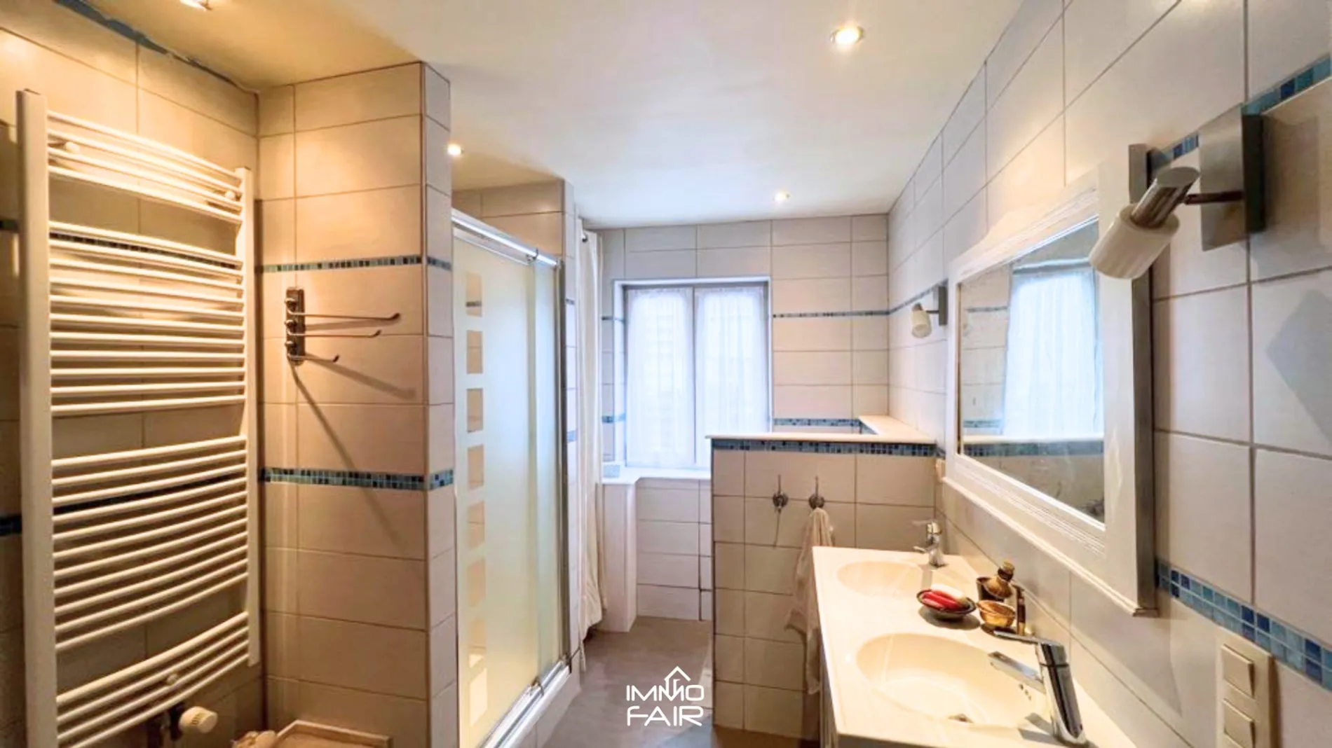Via de trappenhal kom je terecht op de eerste verdieping. Hier bevindt zich de volledig betegelde badkamer, die is uitgerust met een ruime douchecabine, dubbele lavabo en handdoekradiator. Op deze verdieping is ook de eerste slaapkamer van ca. 18 m².