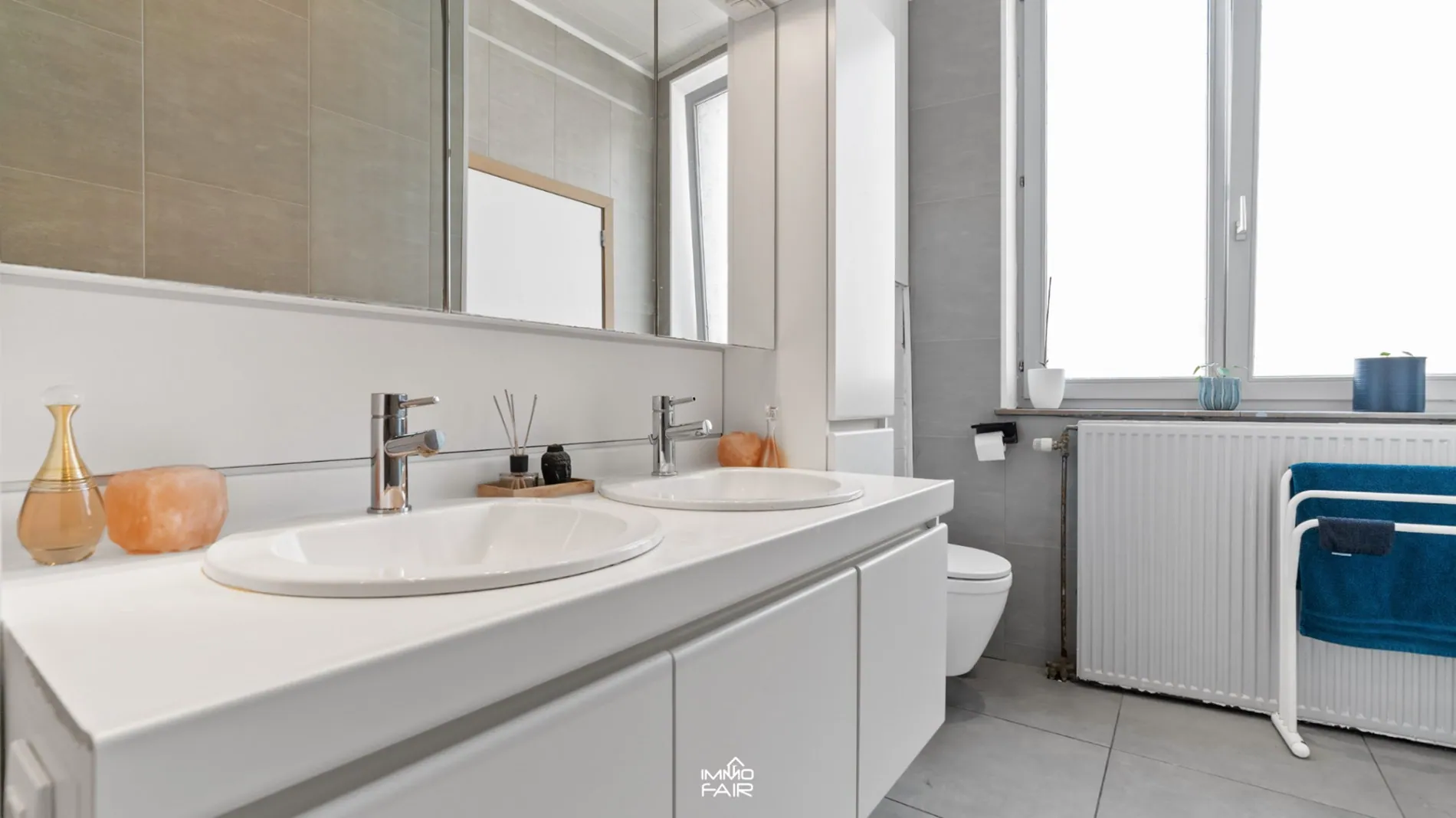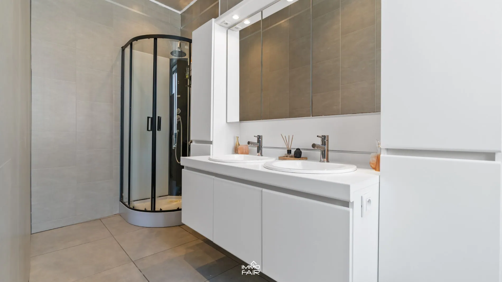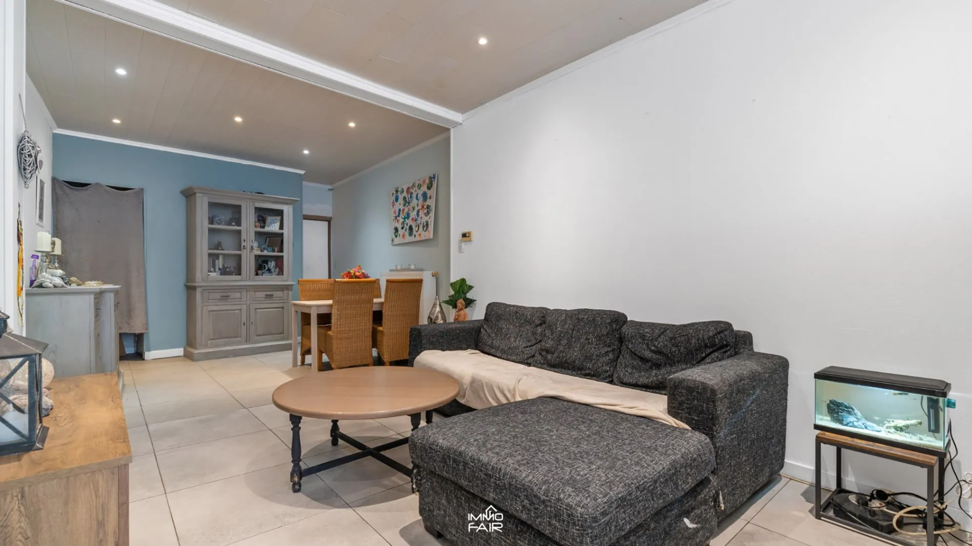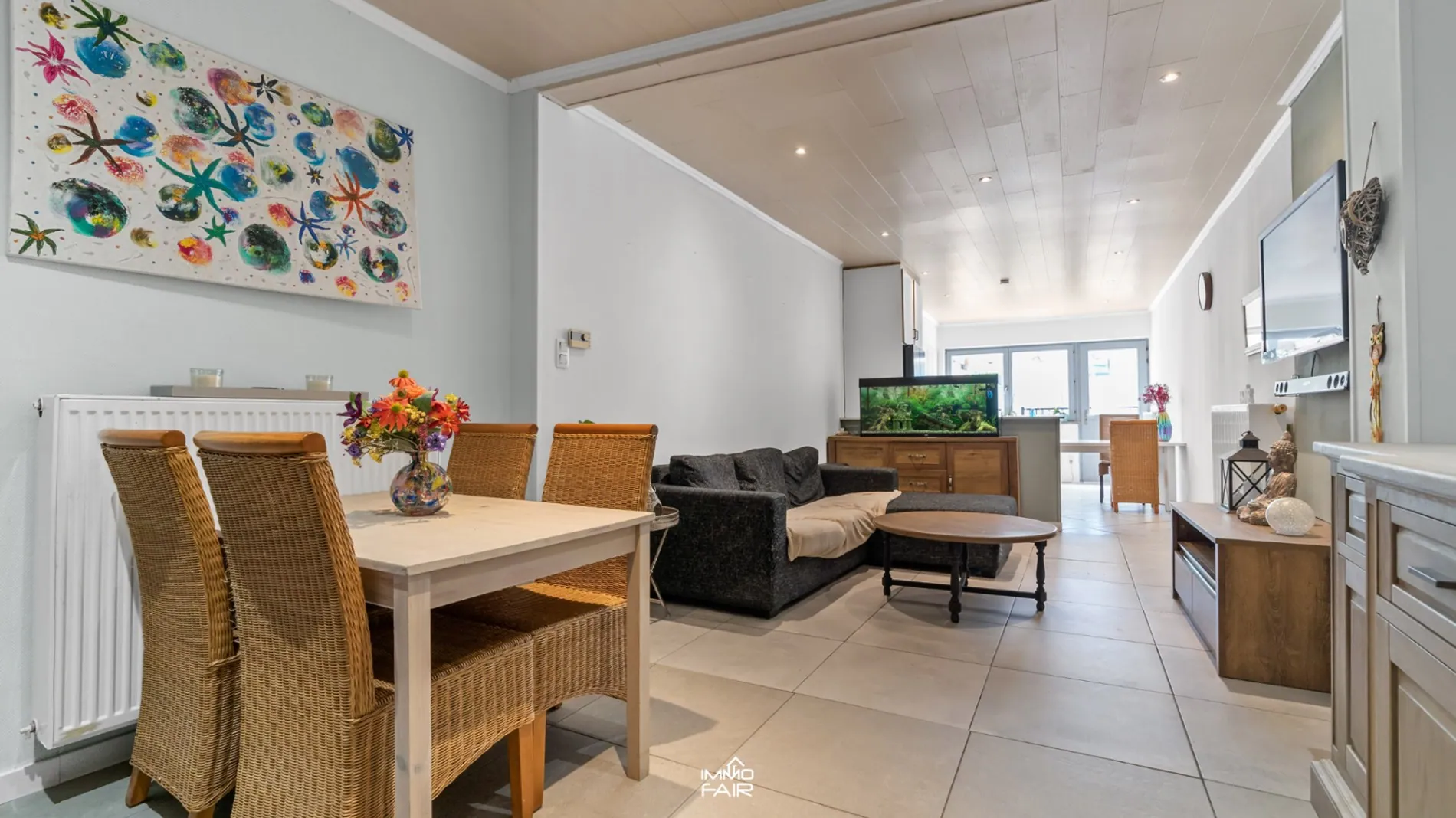 Bij binnenkomst in de inkomhal heb je toegang tot de badkamer en de leefruimte. De badkamer is voorzien van een toilet, douche en dubbel lavabomeubel. De leefruimte vloeit naadloos over in de eetkamer, die aansluit op de keuken. De keuken is uitgerust met een kookplaat met dampkap, een vaatwasser en oven en biedt directe toegang tot de zonnige tuin.