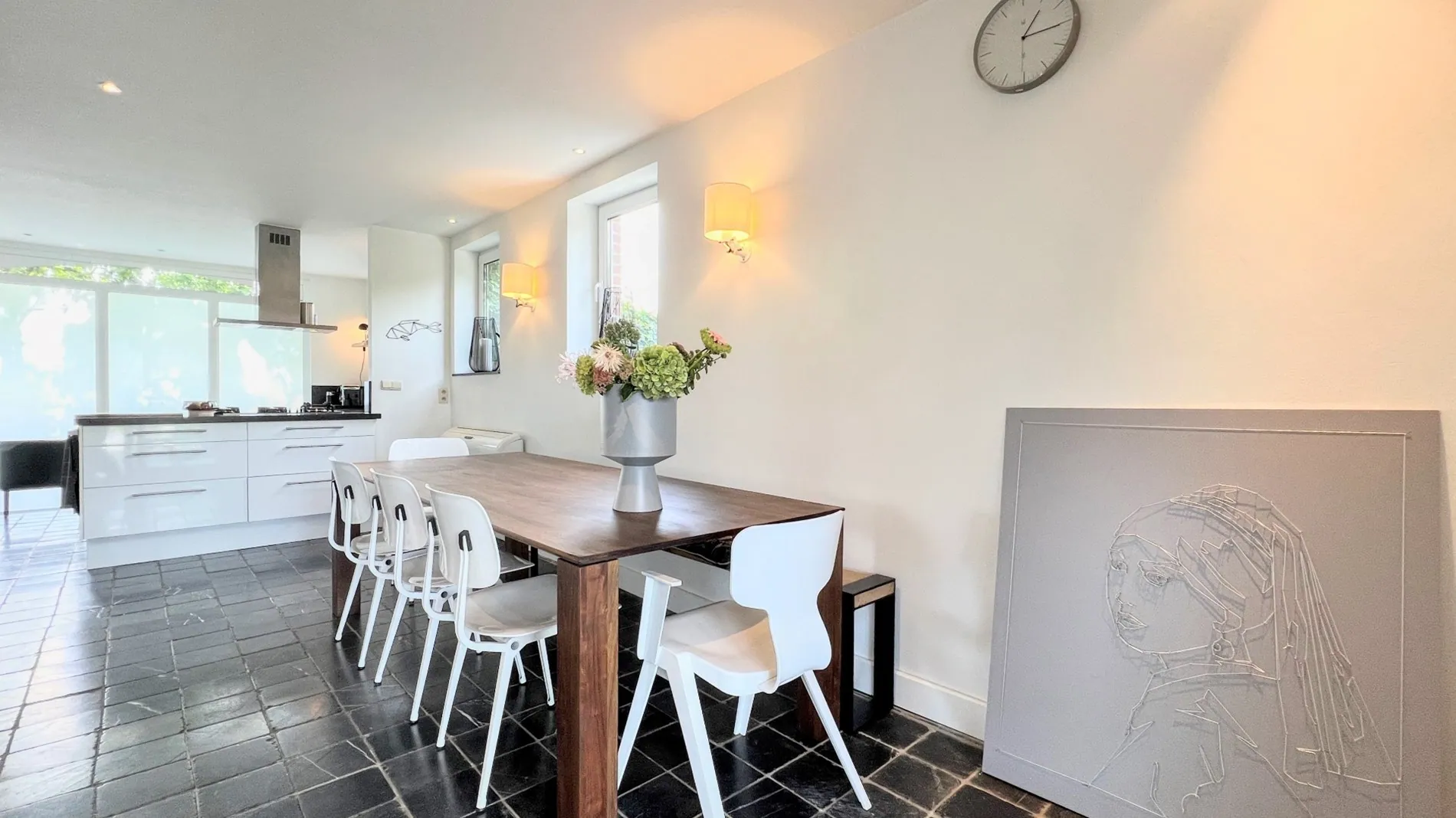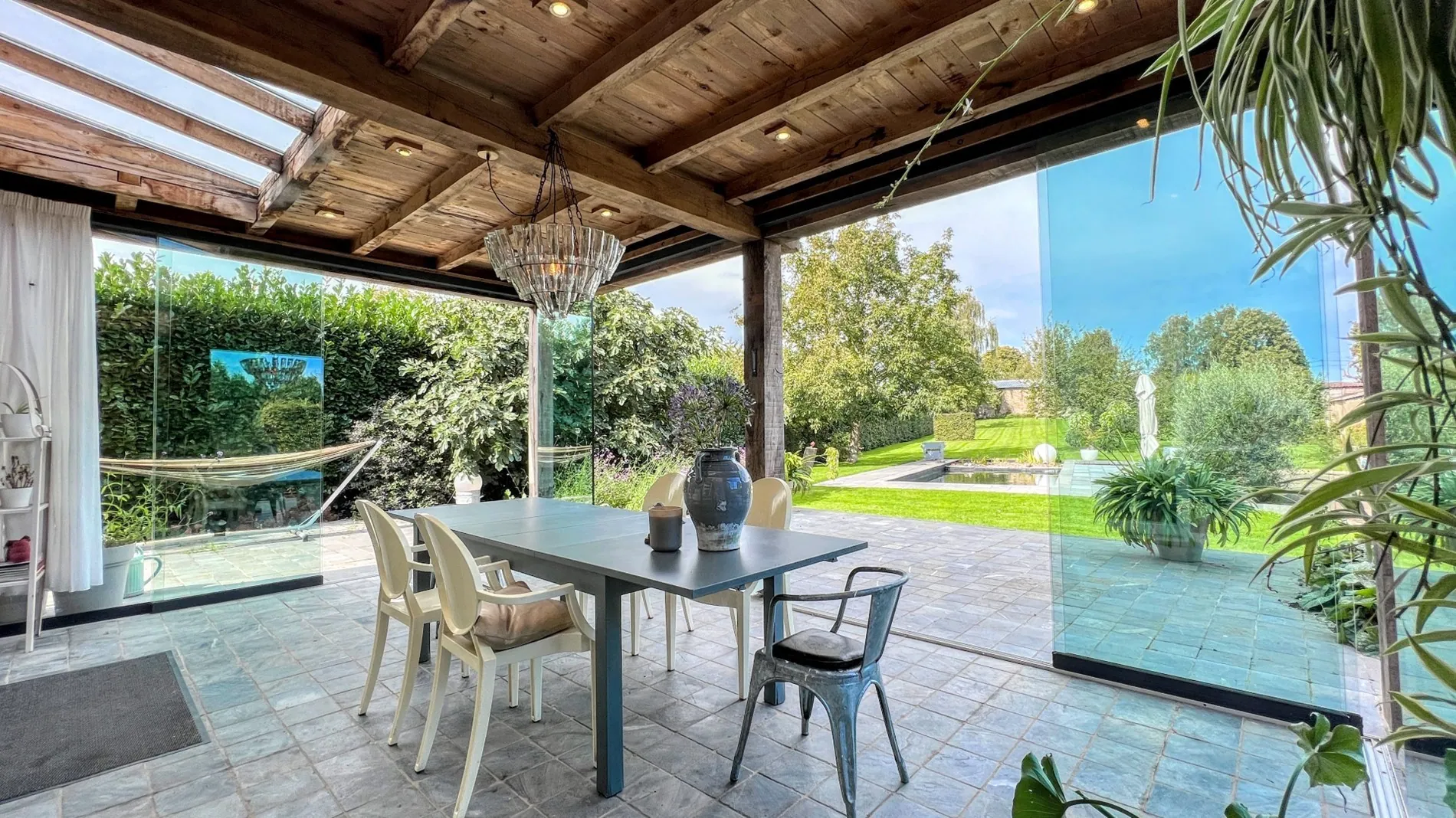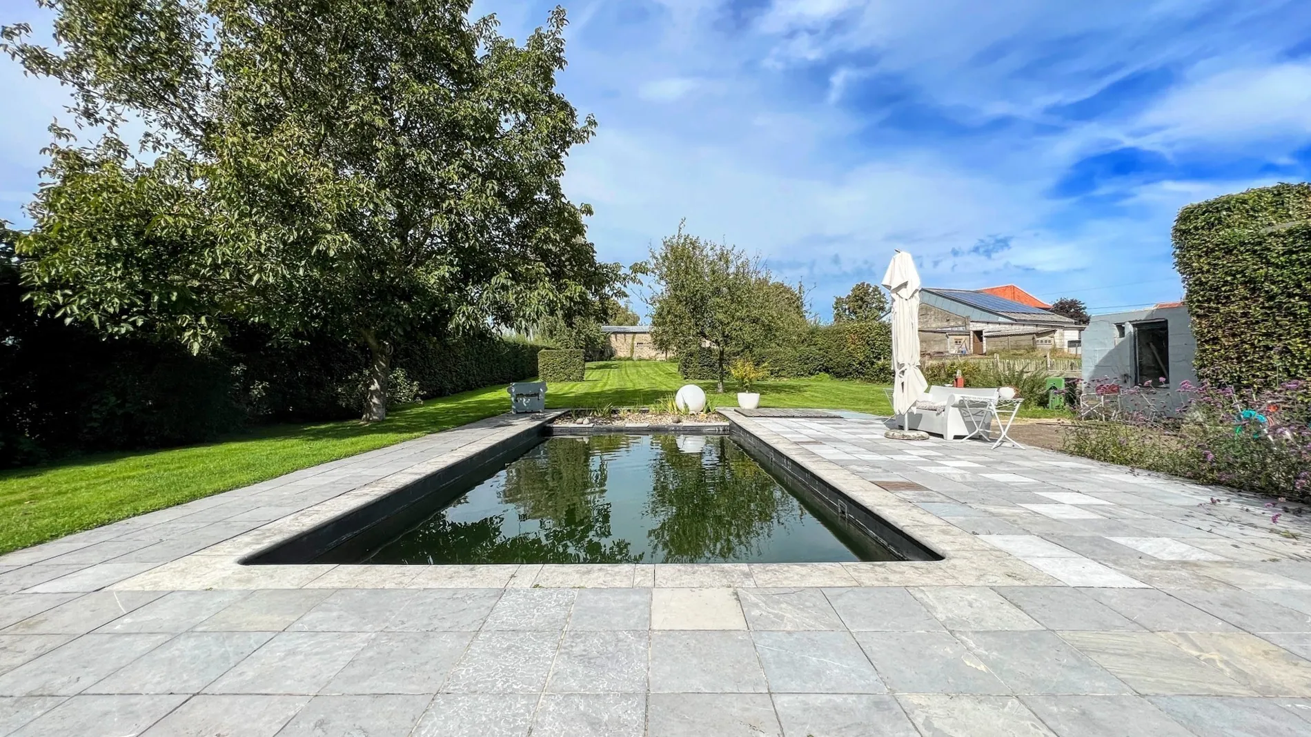Via de inkomhal heb je toegang tot de royale leefruimte. Naastgelegen is er een moderne, volledig afgewerkte keuken. Vanuit de keuken bereik je het overdekte terras met uitzicht op de tuin met zwemvijver. De riante, netjes onderhouden tuin is voorzien van een poolhouse.