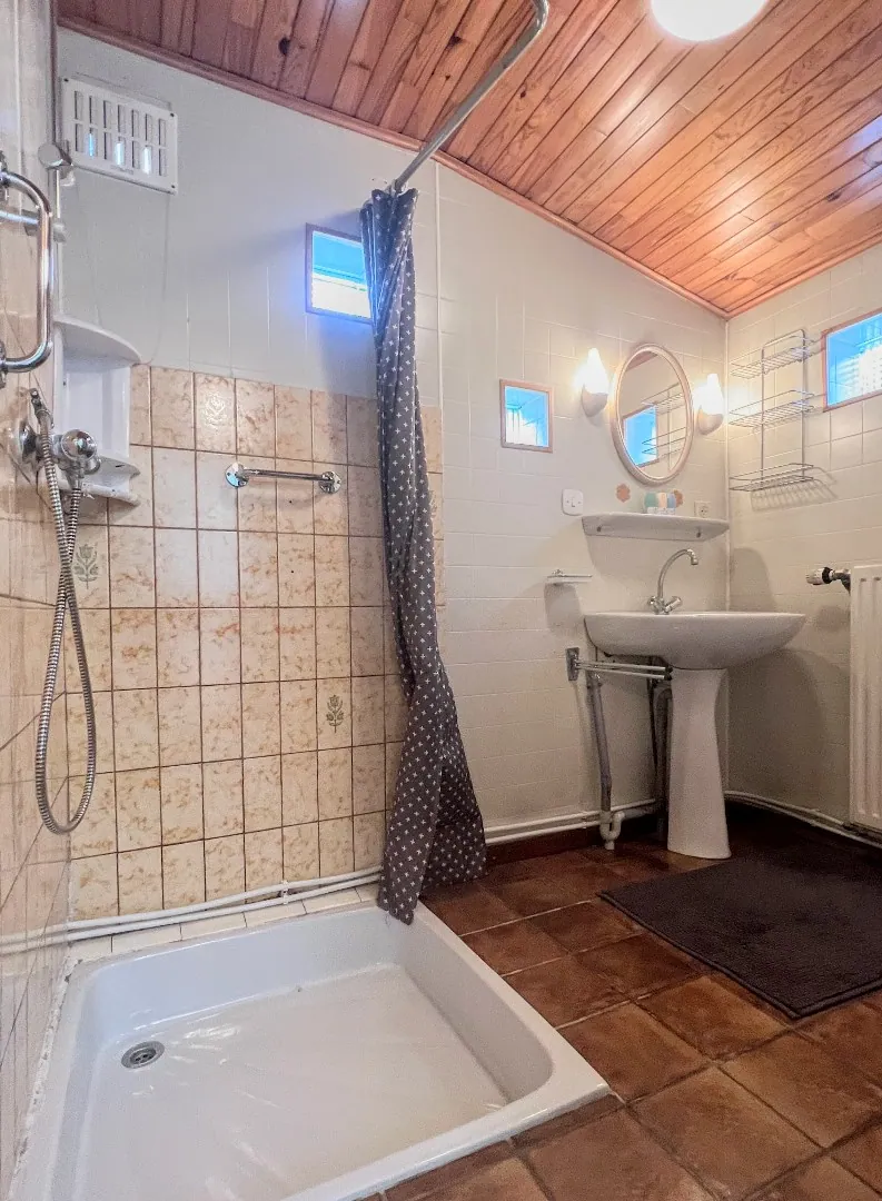 Verder is er een badkamer met douche en lavabo en een afzonderlijk toilet. Naastgelegen is er een veranda die uitgeeft op de tuin. De tuin is netjes onderhouden en voorzien van extra bergruimte.