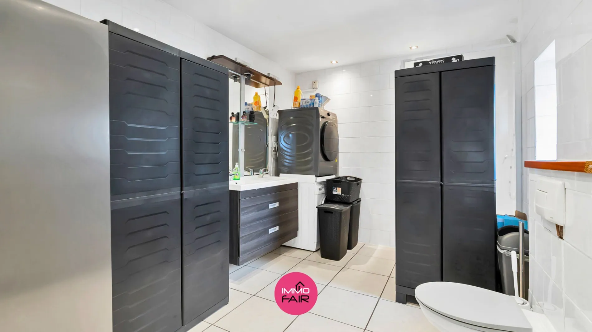 Verder heb je via de keuken ook toegang tot de eerste badkamer die voorzien is van een toilet, douchecabine, dubbele lavabo en aansluiting voor een wasmachine en droogkast.