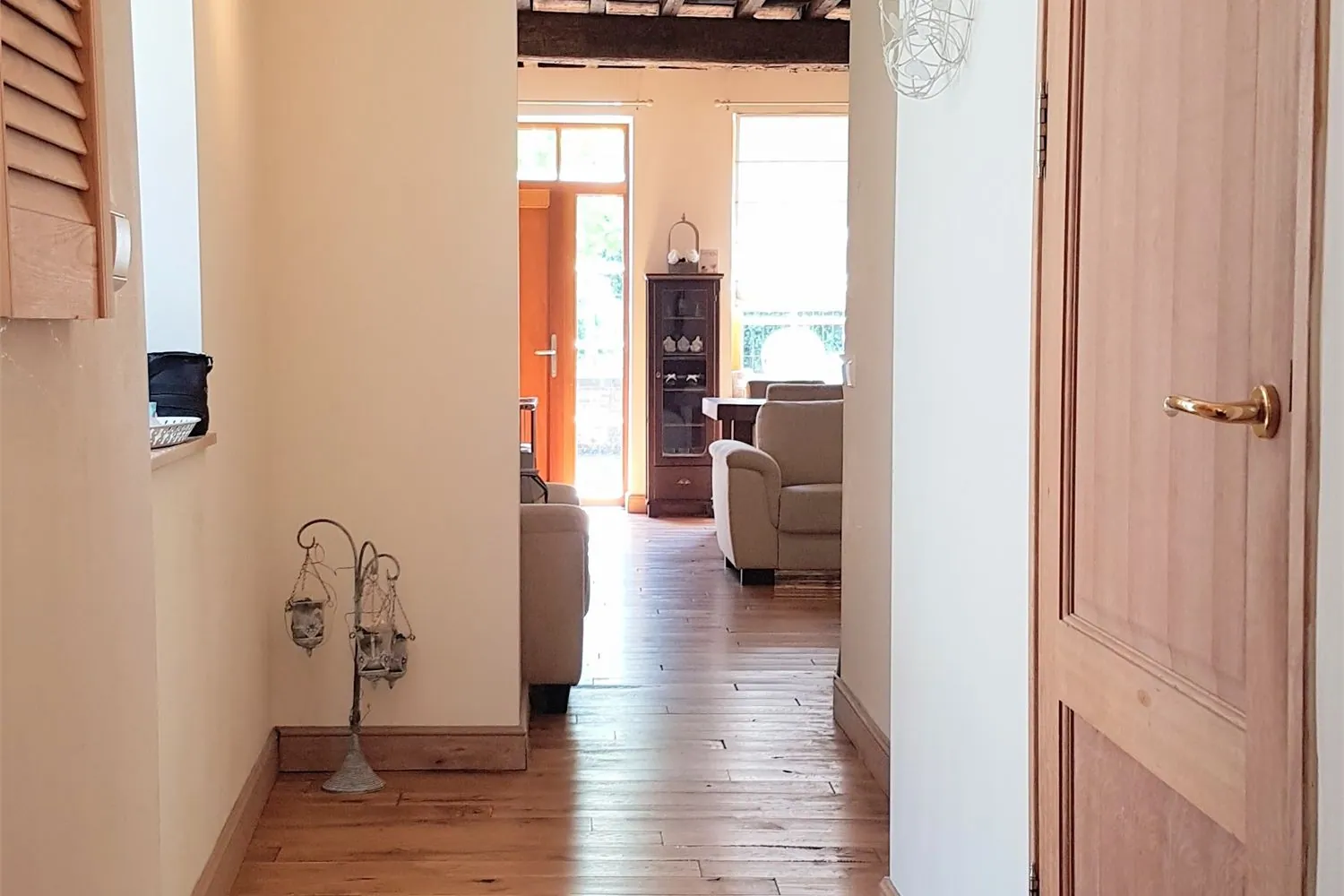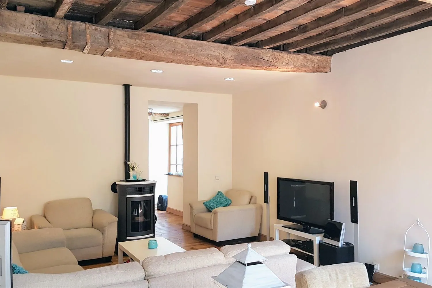In de sfeervolle woonkamer van 32 m² springt onmiddellijk de rustieke eiken plankenvloer en het ontbloot eikenhouten plafond in het oog.
