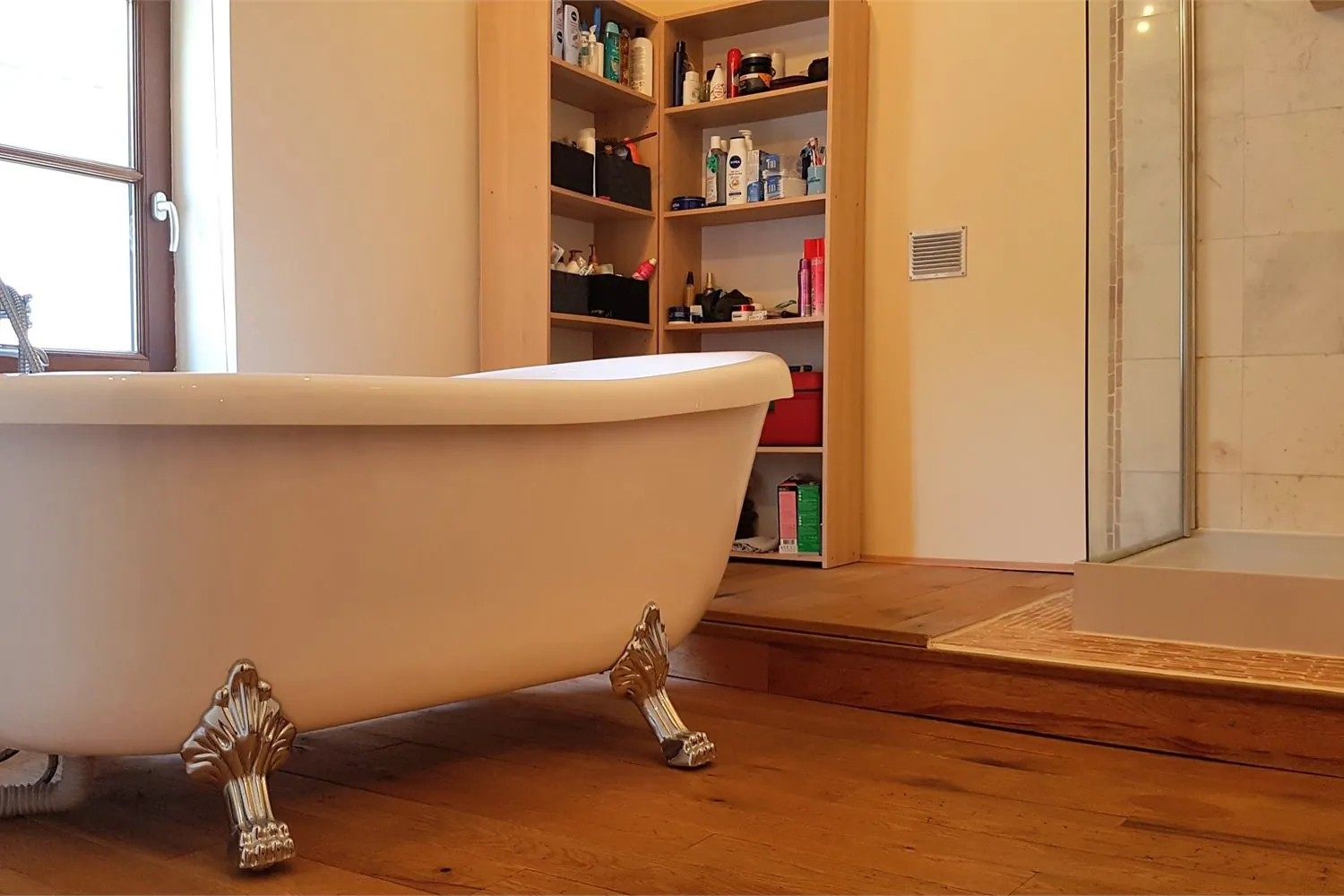 De badkamer op de benedenverdieping is voorzien van een inloopdouche, een lavabo, een toilet en heeft een aansluiting voor wasmachine en ... droogkast. Naastgelegen is er een praktische berging.