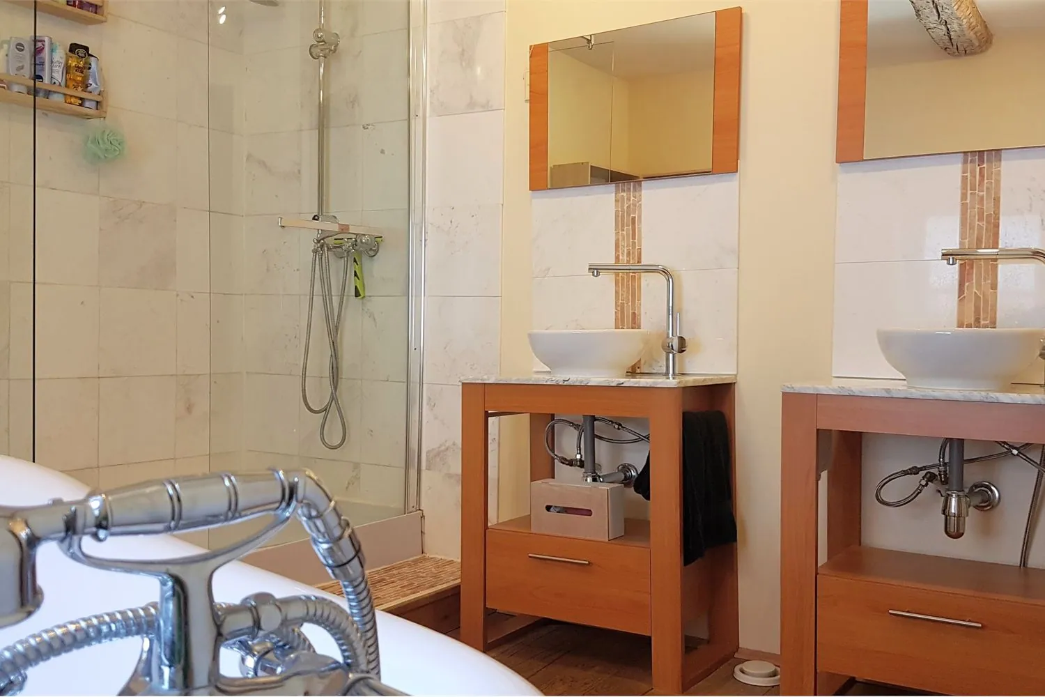 Eén slaapkamer heeft een overdekt privé-terras waarvan je kan genieten van de avondzon. In deze badkamer zijn er 2 afzonderlijke wastafels; een douchecabine en een romantisch vrijstaand ligbad op pootjes.